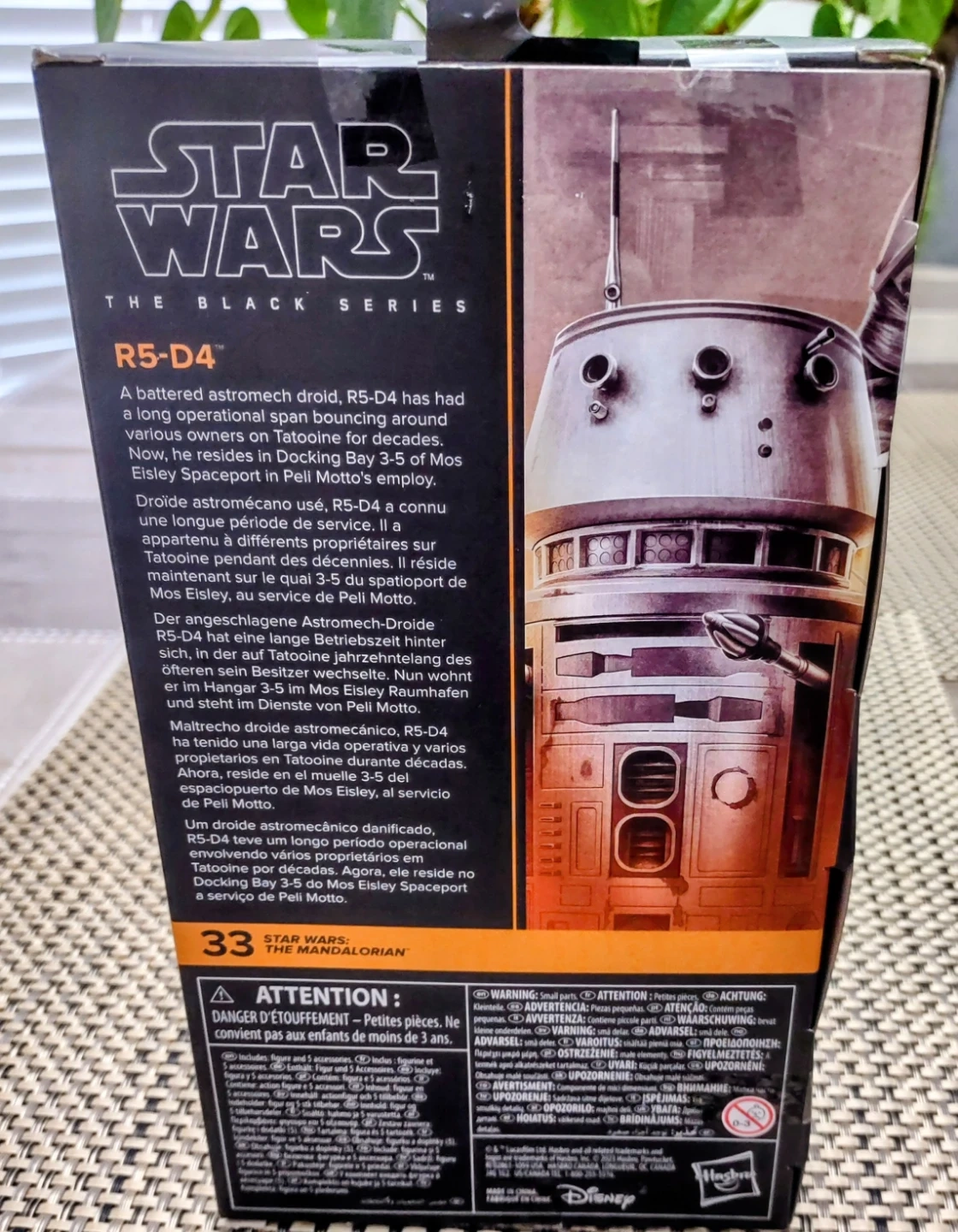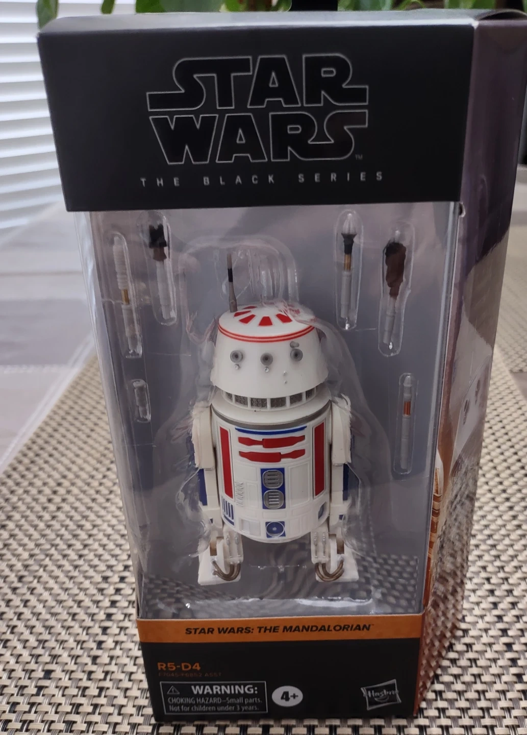 Selling a Star Wars The Black Series R5-D4 Astromech Droid figure from The Mandalorian! It's in great condition and comes with all the accessories shown in the box. This droid has a long operational span bouncing around various owners on Tatooine prior to his current role in Docking Bay 3-5 of Mos Eisley Spaceport in Peli Motto's employ