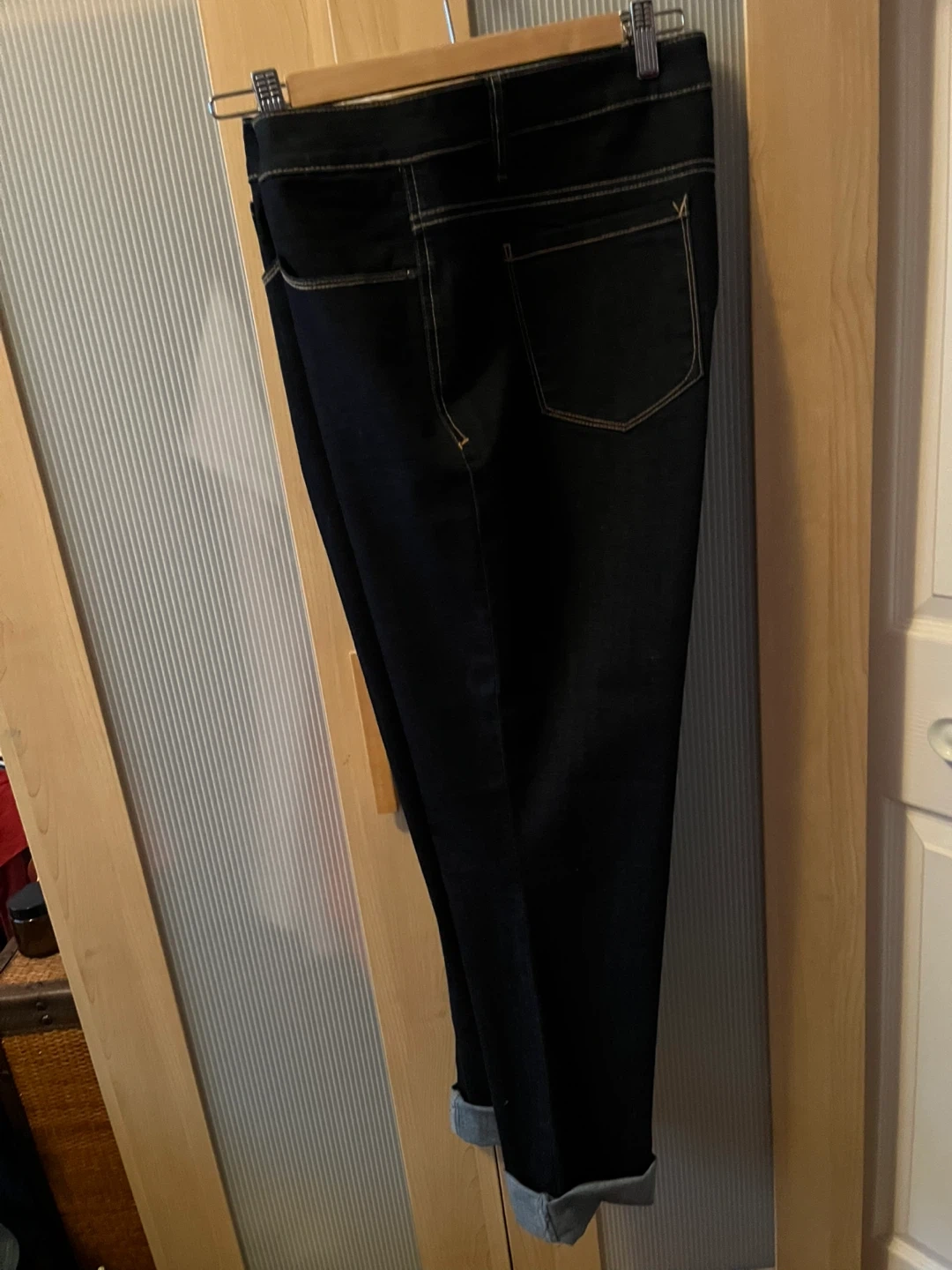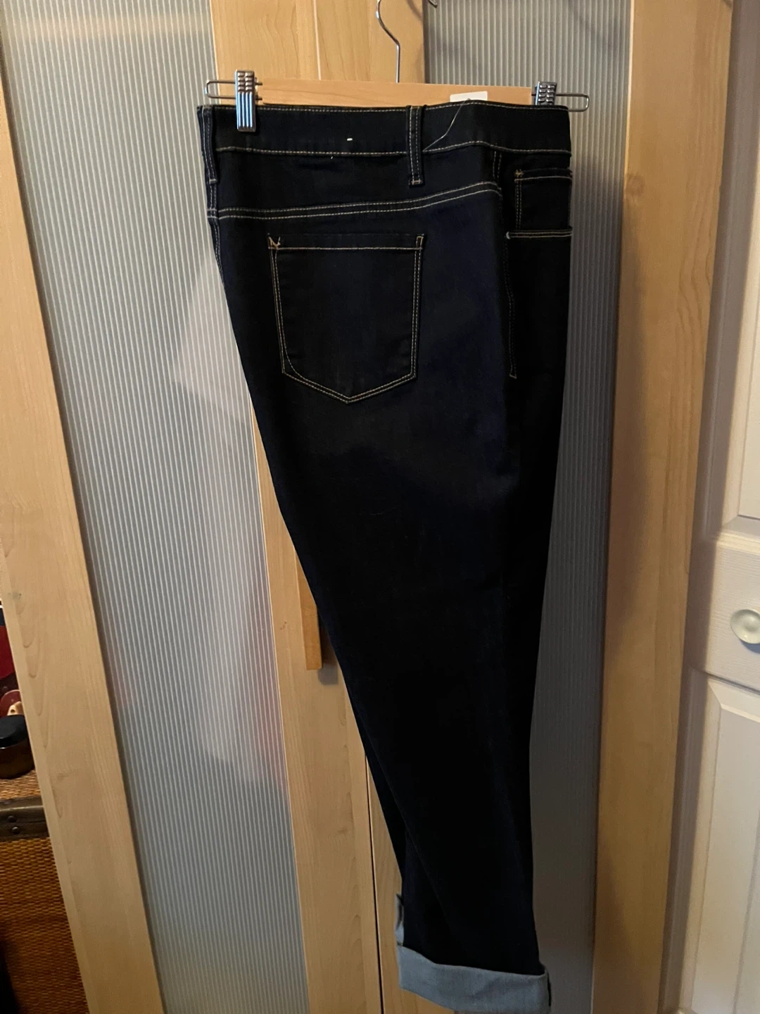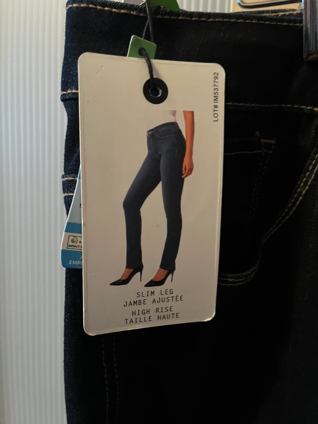 Dark wash denim jeans. They're a high-rise fit with a slim leg cut. Comfortable for everyday wear. Made with a cotton blend.