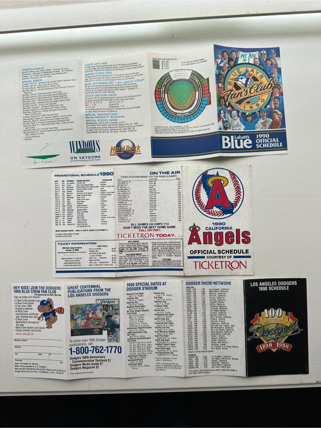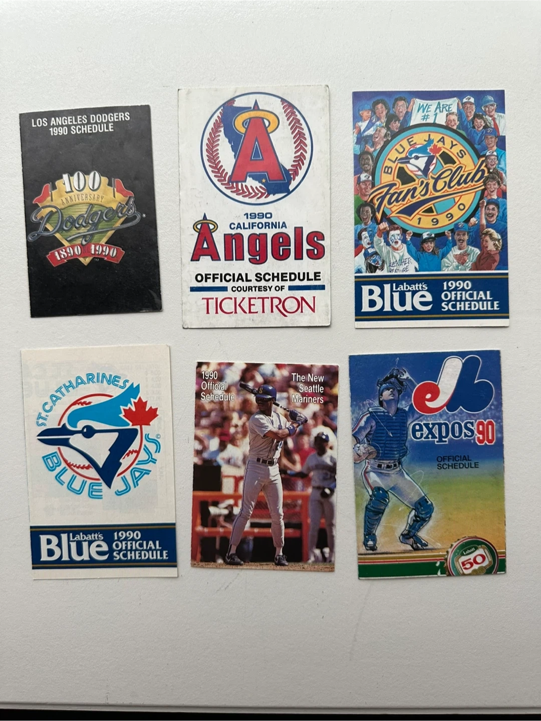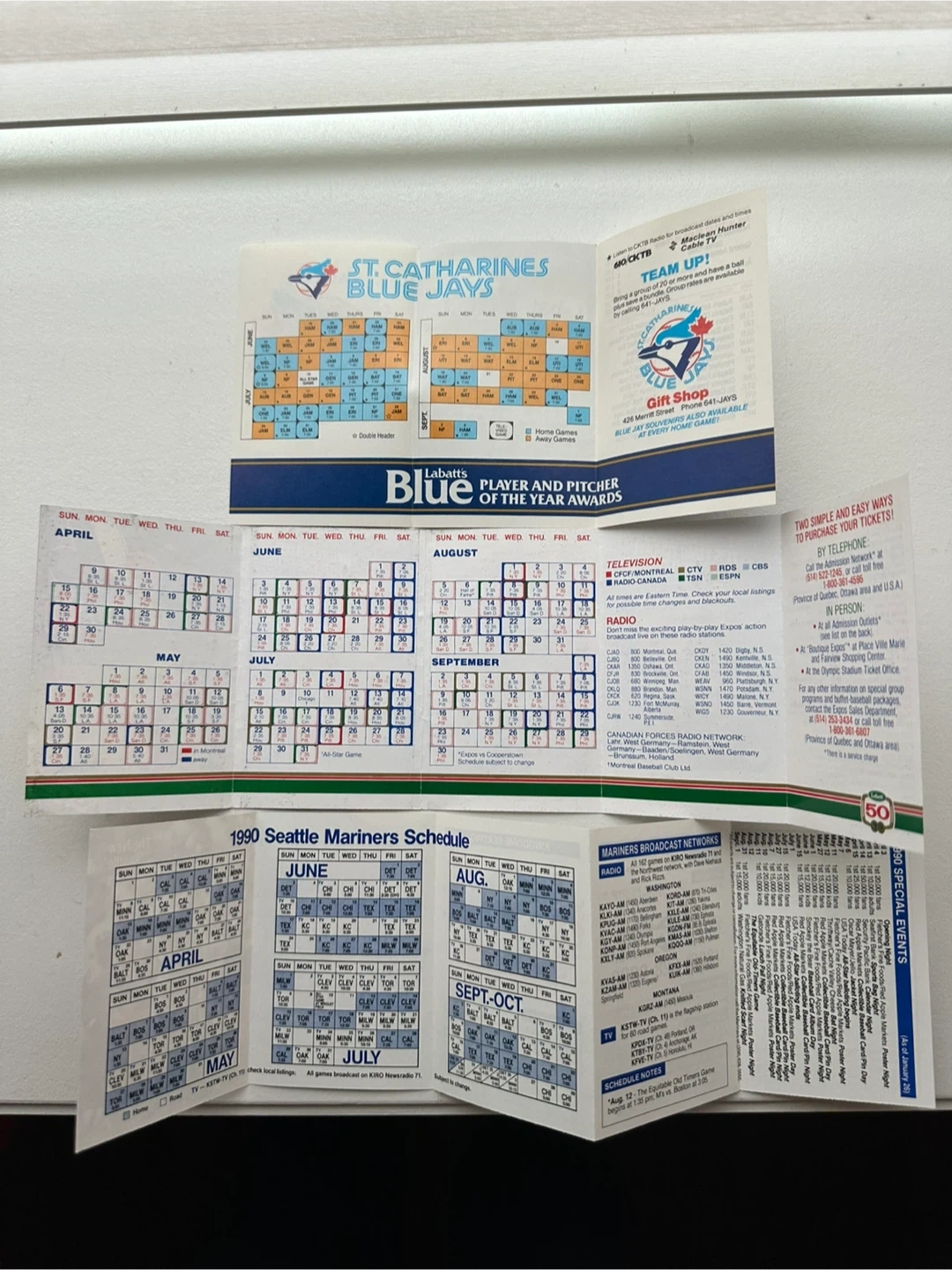 1990 pocket schedules for the Toronto and St. Catharines Blue Jays, Dodgers, Mariners, Angels, and Expos.