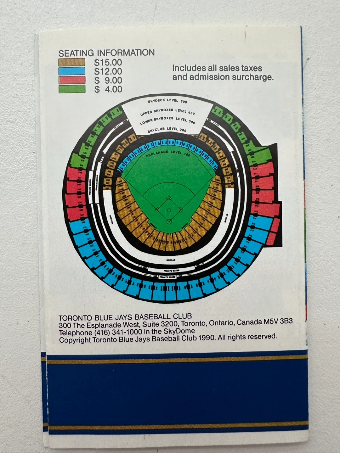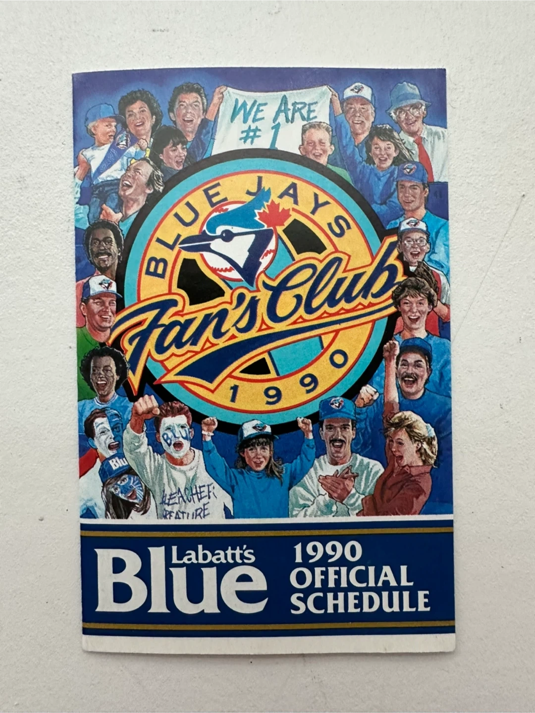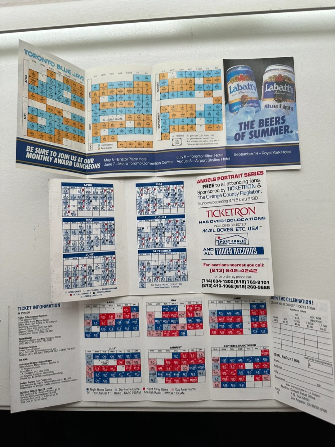 1990 pocket schedules for the Toronto and St. Catharines Blue Jays, Dodgers, Mariners, Angels, and Expos.