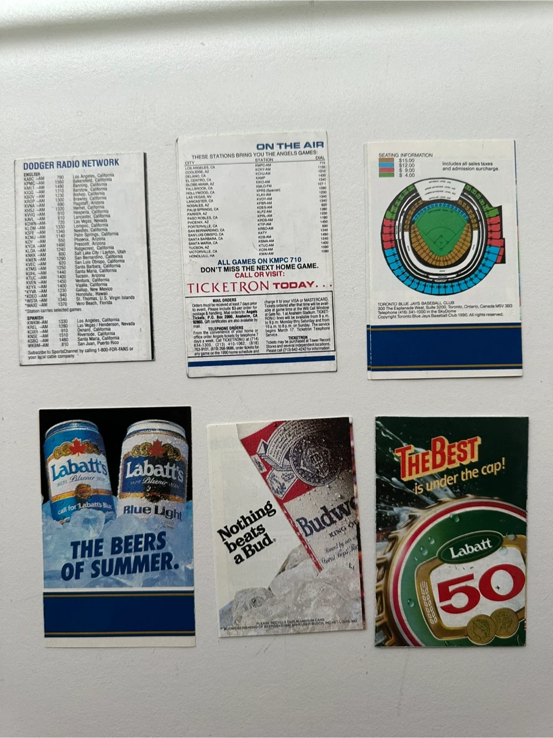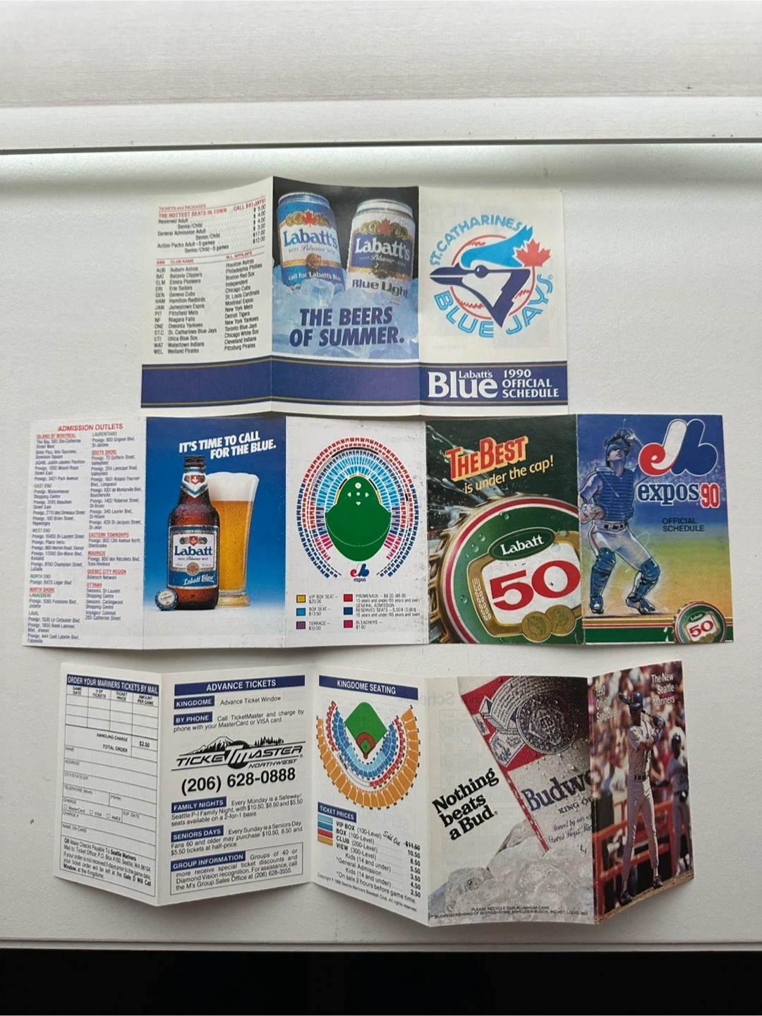 1990 pocket schedules for the Toronto and St. Catharines Blue Jays, Dodgers, Mariners, Angels, and Expos.