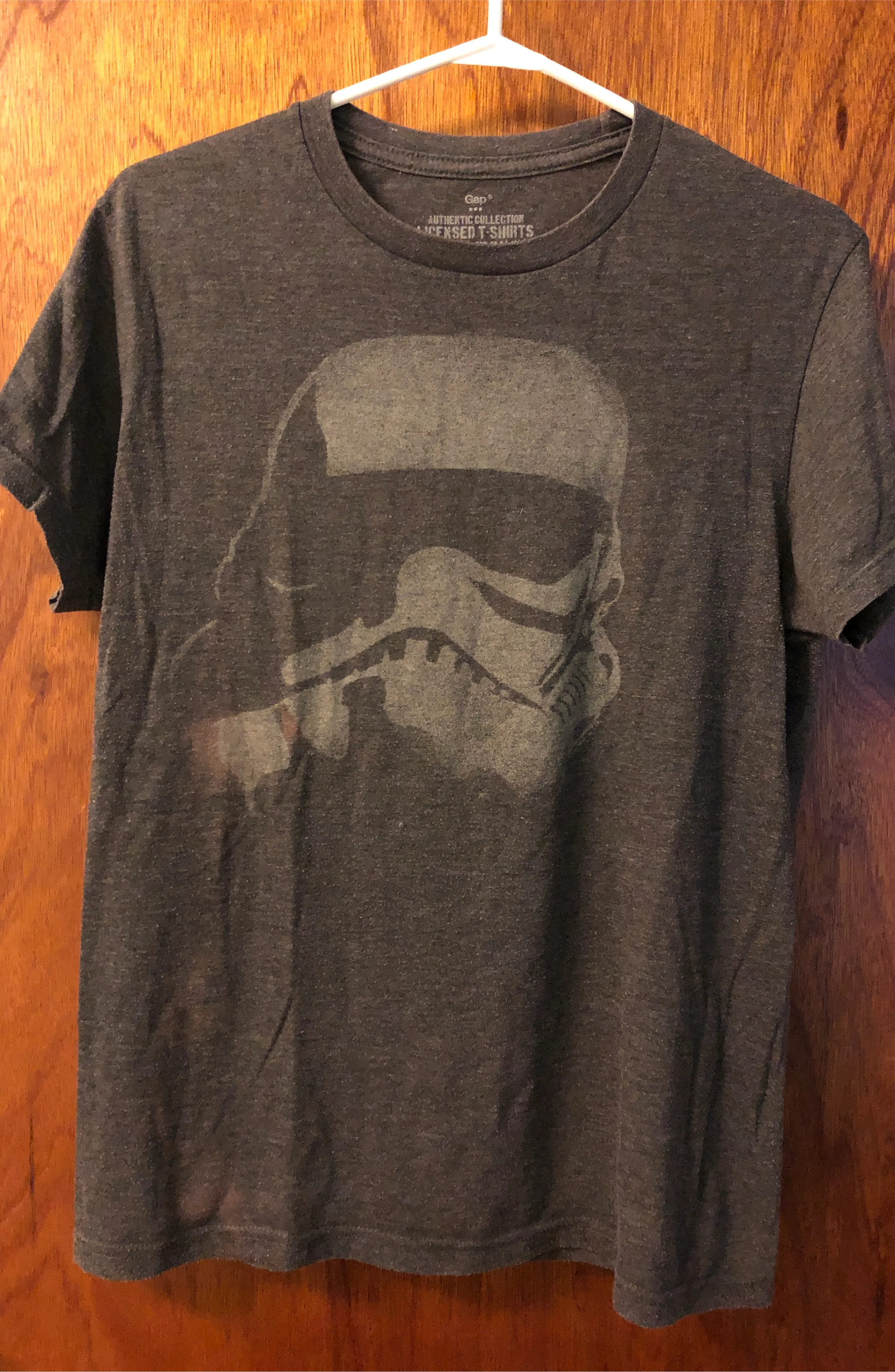 Selling a Gap Authentic Collection Licensed T-Shirt featuring a Star Wars Stormtrooper graphic. It's a size medium and made from a blend of cotton and polyester. Perfect for any Star Wars fan!