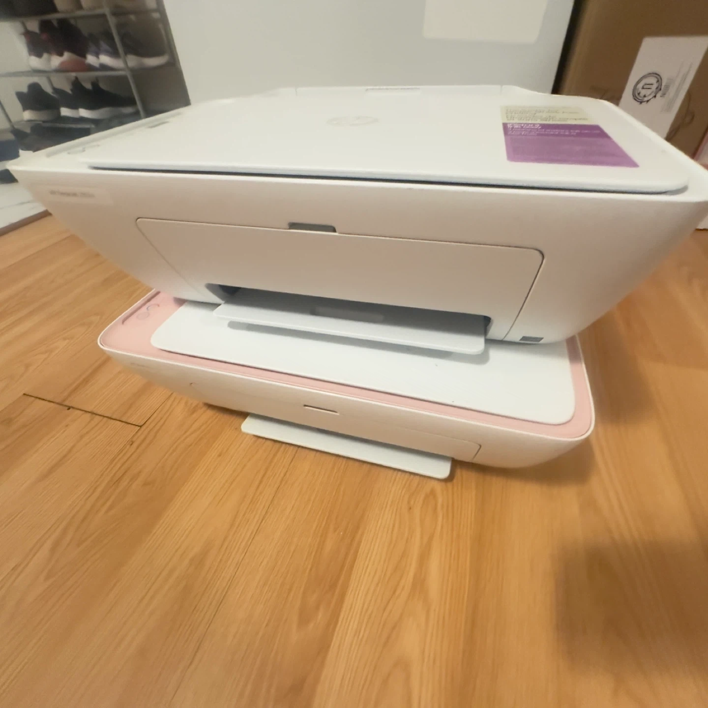 This is an HP DeskJet 2600 series all-in-one printer. It's a compact inkjet printer, scanner, and copier. The printer comes in white with pink accents. Moving bought new ones,inks in both of them. Need gone urgently 30$ for one or 50$ for both