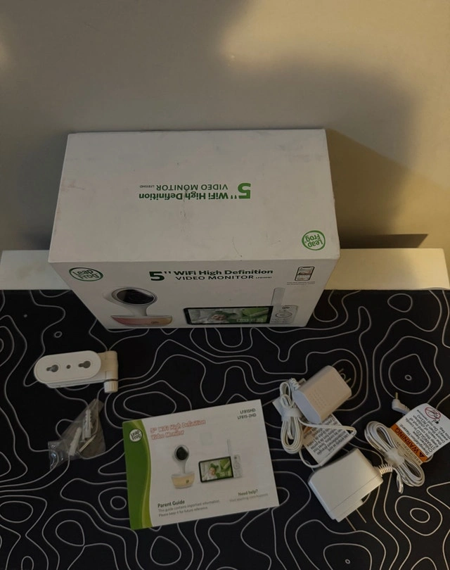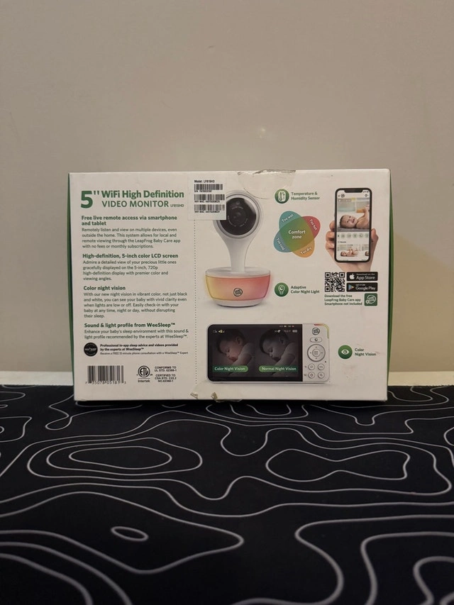 Monitor your baby from anywhere with this WiFi baby monitor featuring a 5" HD color LCD screen and full-color night vision. View and listen live on multiple devices through the LeapFrog Baby Care app with no fees or subscriptions. Features: 5" HD color display, WiFi connectivity for remote viewing, Color night vision for low-light clarity, Sound & light profile from WeeSleep™, Temperature & humidity sensor, Professional in-app sleep advice and videos, Free live access via smartphone or tablet. All cables and accessories included. Open box new, fully tested and working perfectly. You can test it in person before purchase. Pickup near Rossland Rd & Brock Rd, Ajax. Cash only.