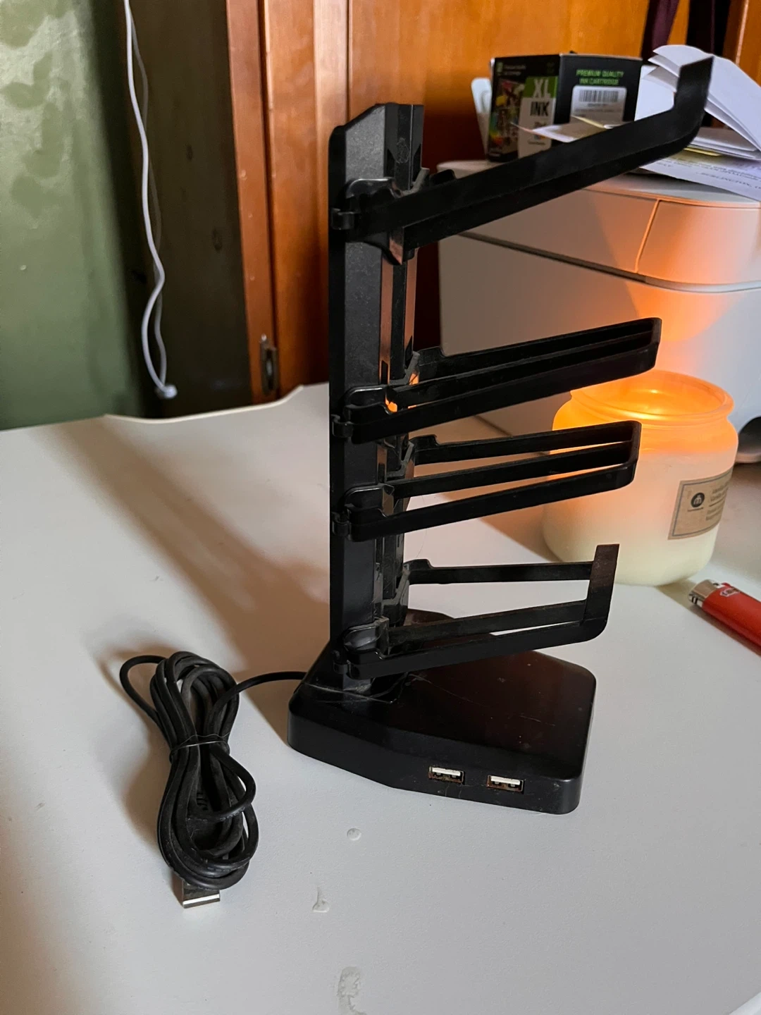 This charging station holds multiple devices vertically. It features 2 front-facing USB ports for convenient charging. Keep your controllers or phones organized and powered up!