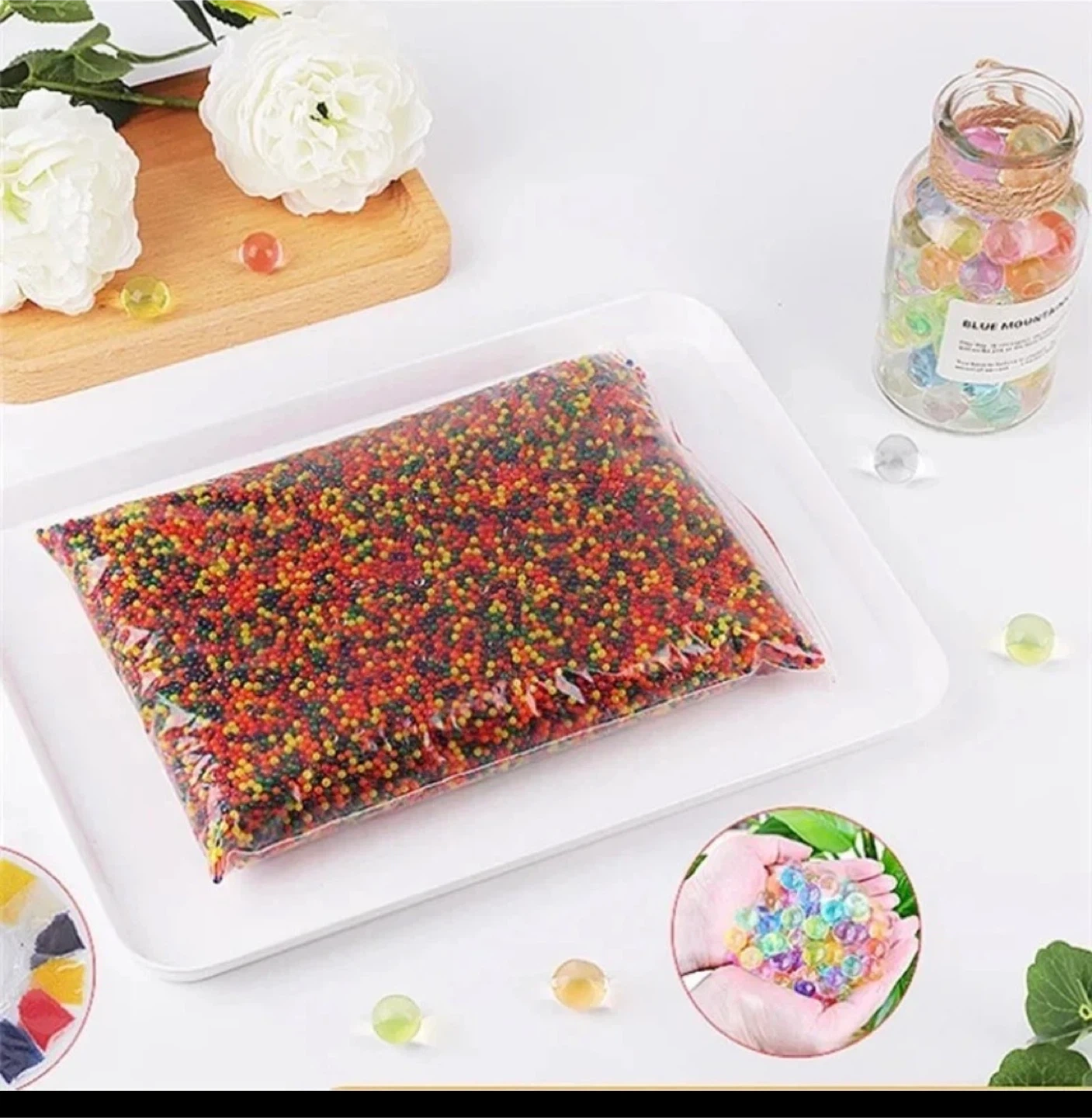 This package contains small, colourful water beads. They're great for adding a decorative touch to vases and other displays. Beads are multi-coloured.