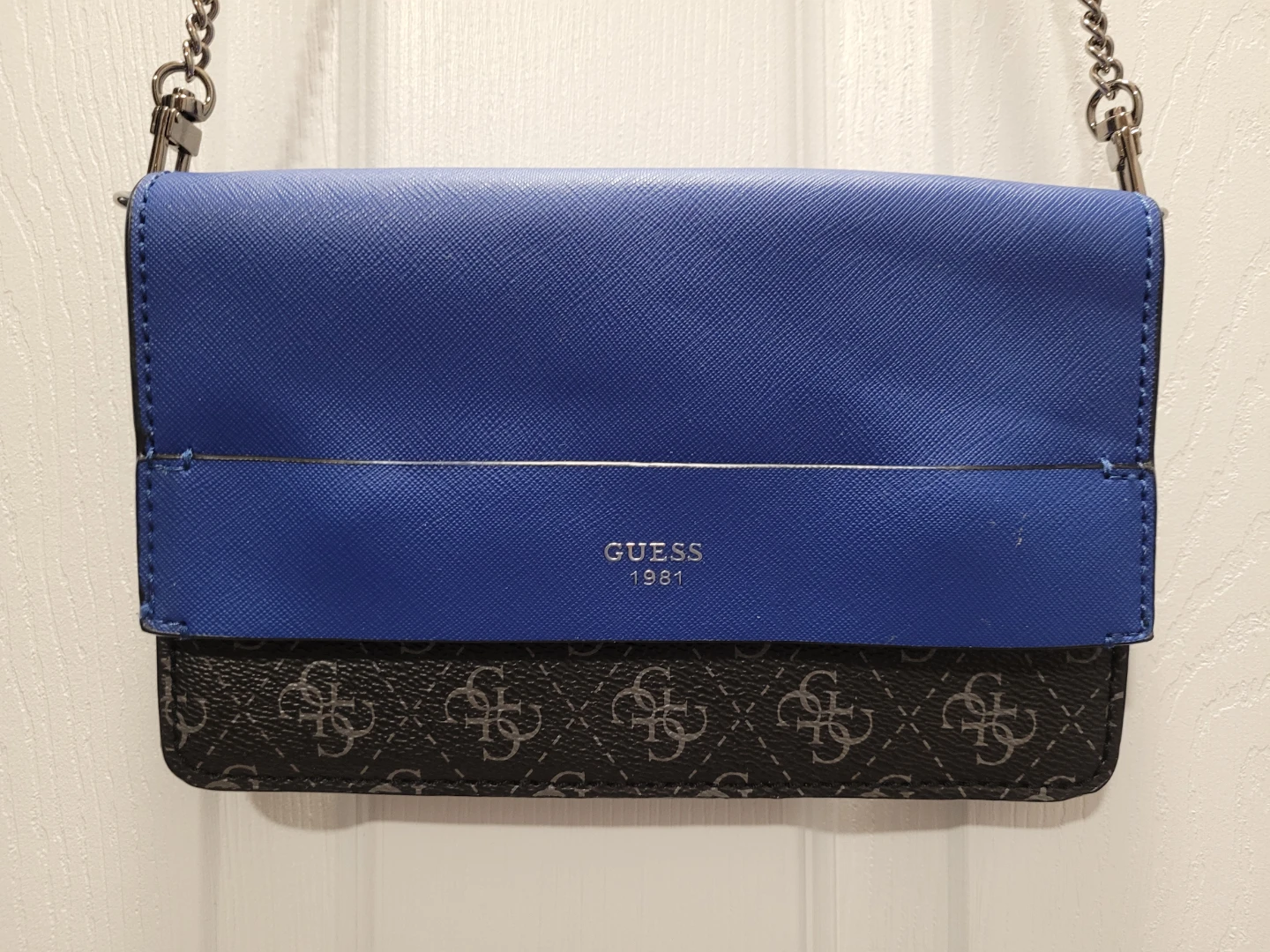 Stylish Guess crossbody bag featuring a blue top and brown patterned bottom. Perfect for carrying essentials!