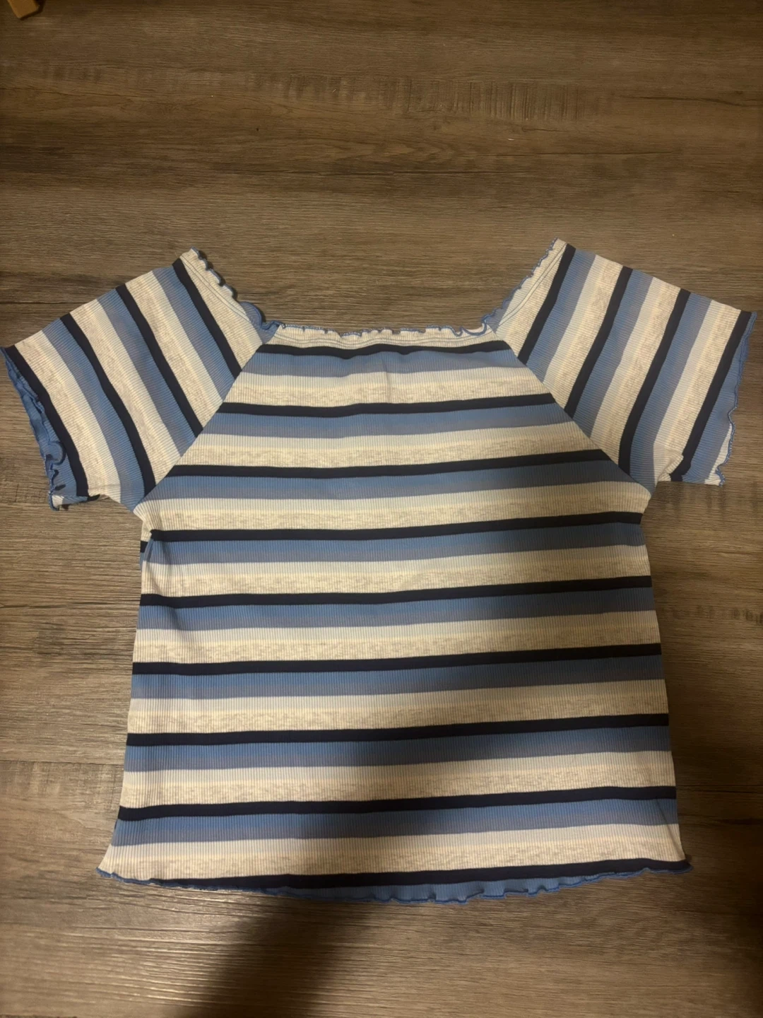 This is a blue and white striped short-sleeve top. It features a scoop neckline with a small zipper detail and lettuce trim on the sleeves and hem. Fits size small women’s.