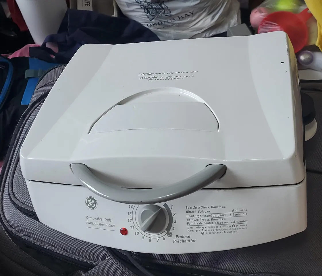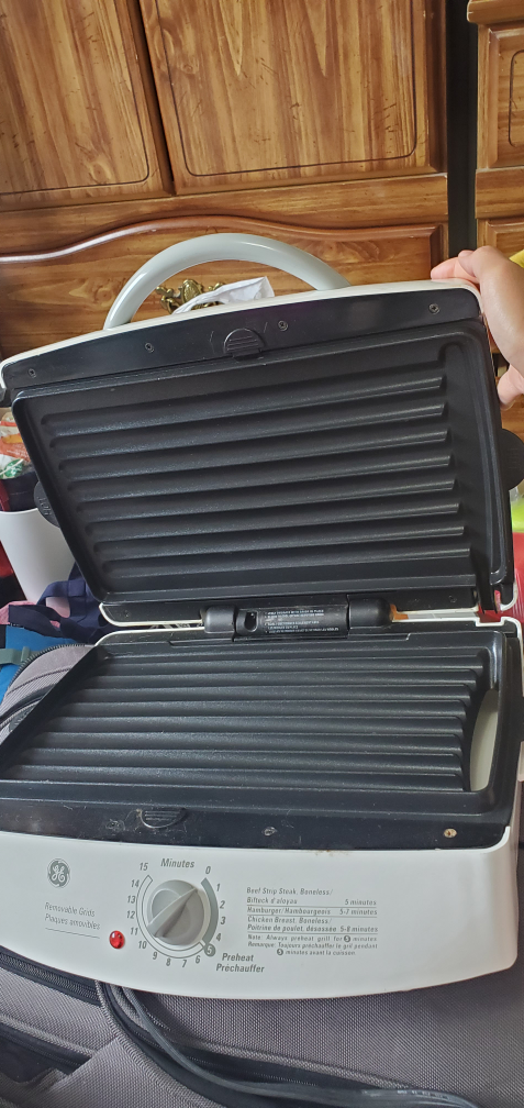 Selling a GE grill with removable grids. It's in good condition and ready for your grilling needs! The appliance features a temperature dial and recommended cooking times for various foods printed on the front.