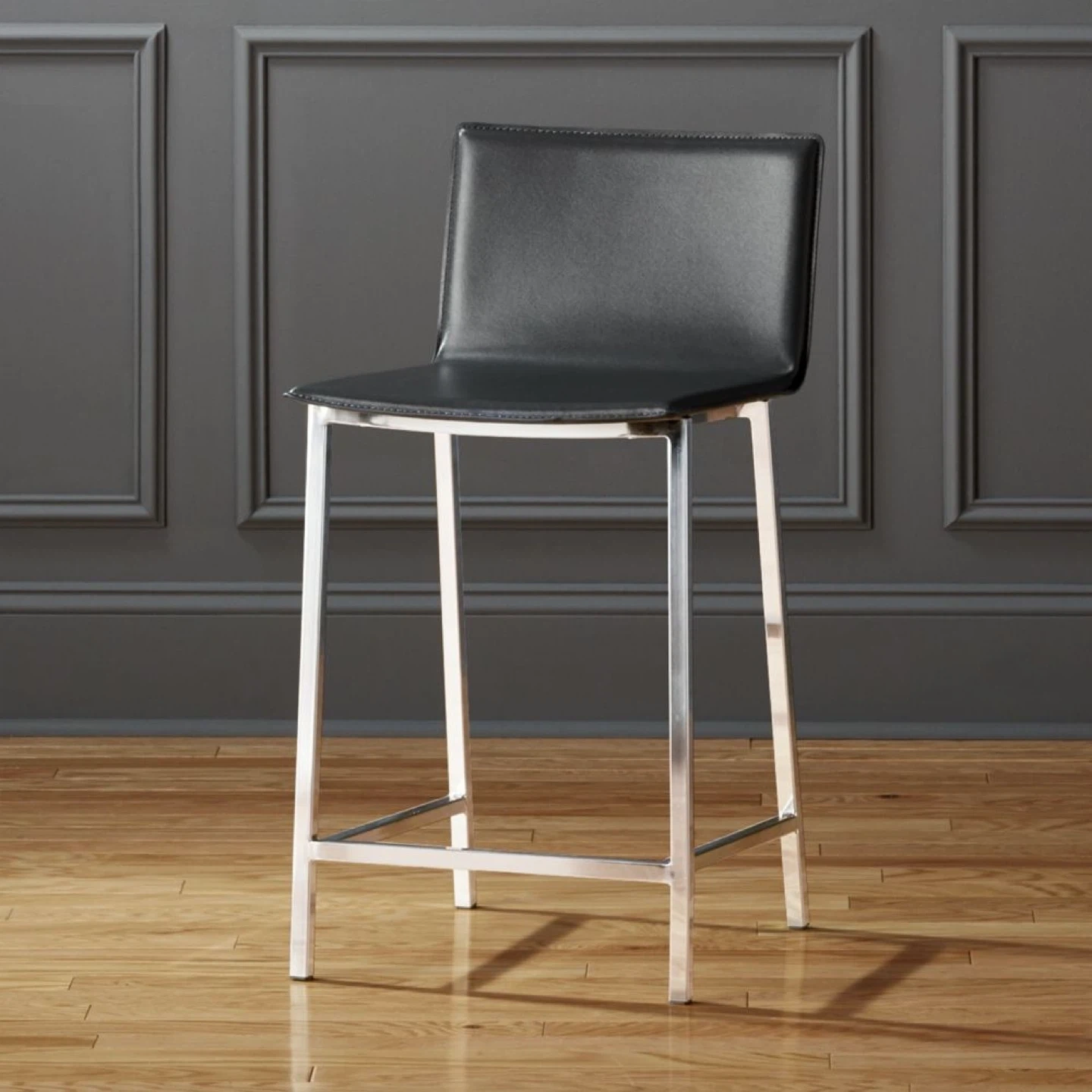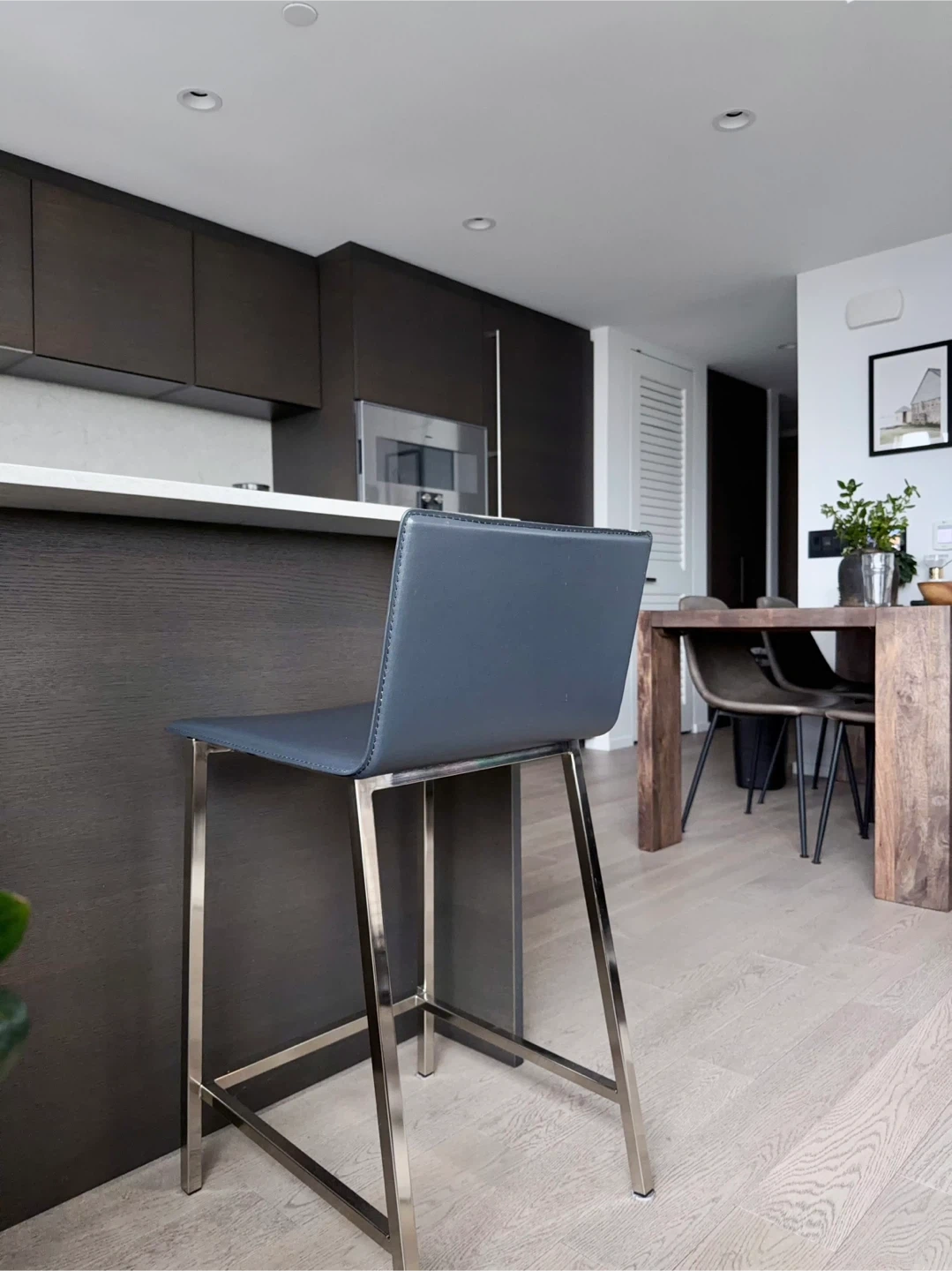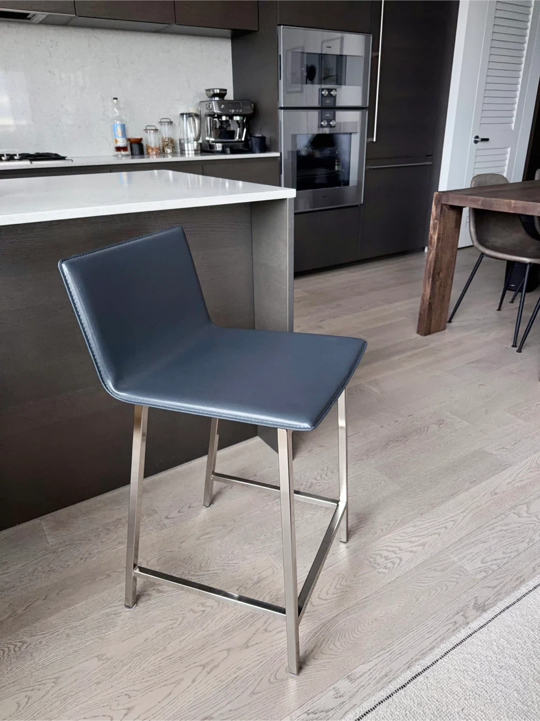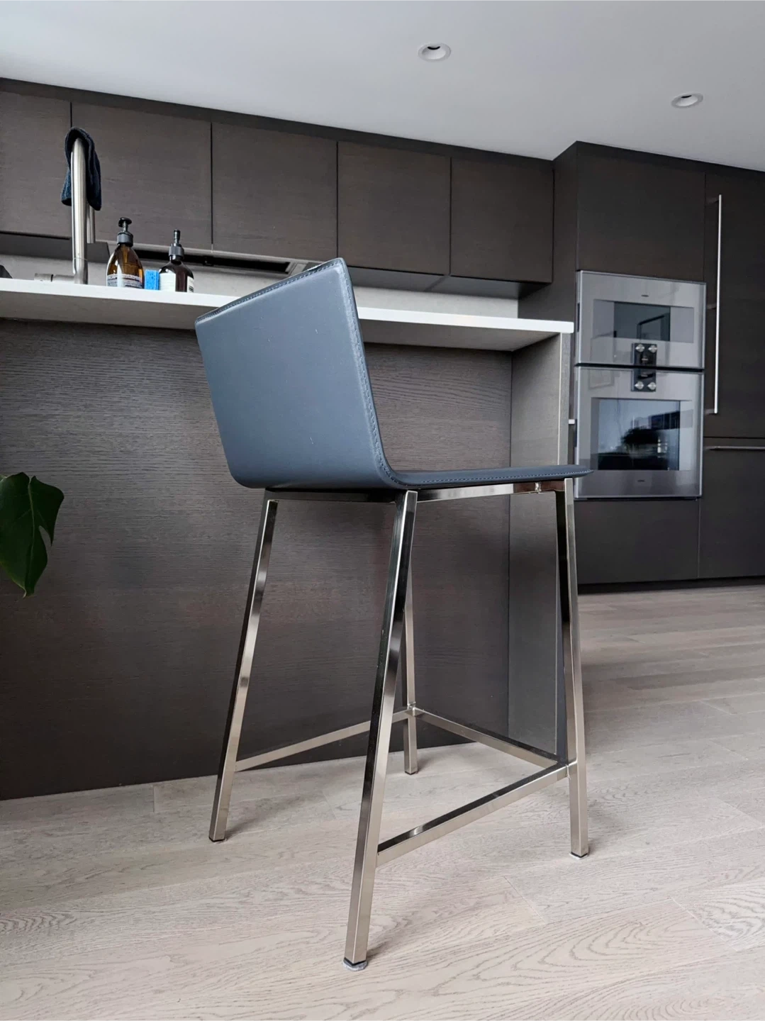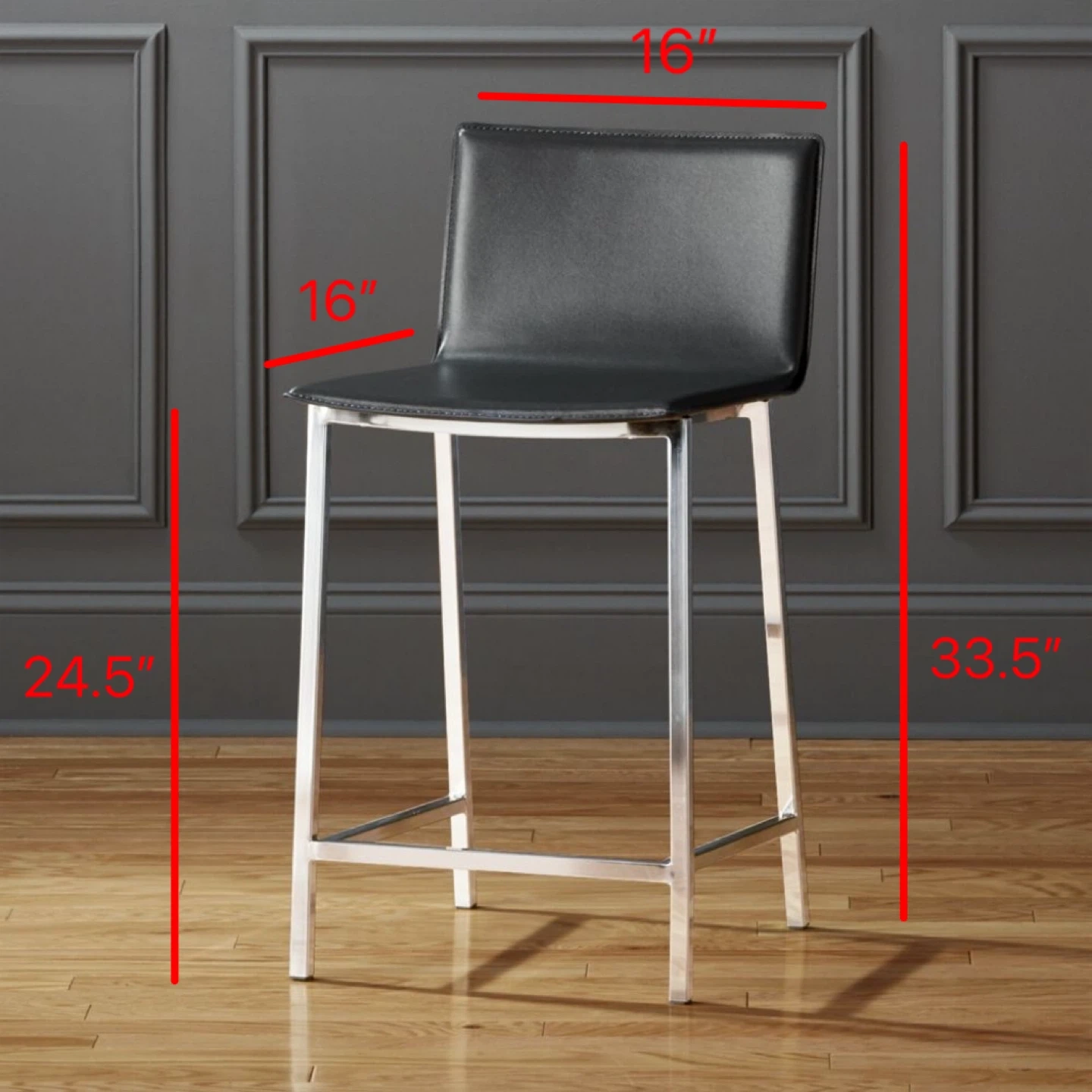 Sleek, modern grey leather bar stool with a chrome frame. Seat is 16" wide and 16" deep. Total height is 33.5" with a seat height of 24.5".