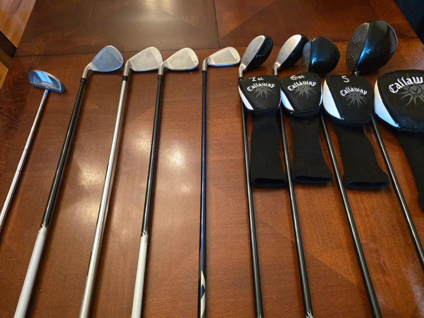 : Driver, Wood 5,. hybrid 6 & 7, Irons 3, 8, 9(not in the set, added from other brand), Sand, Putter and Bag.