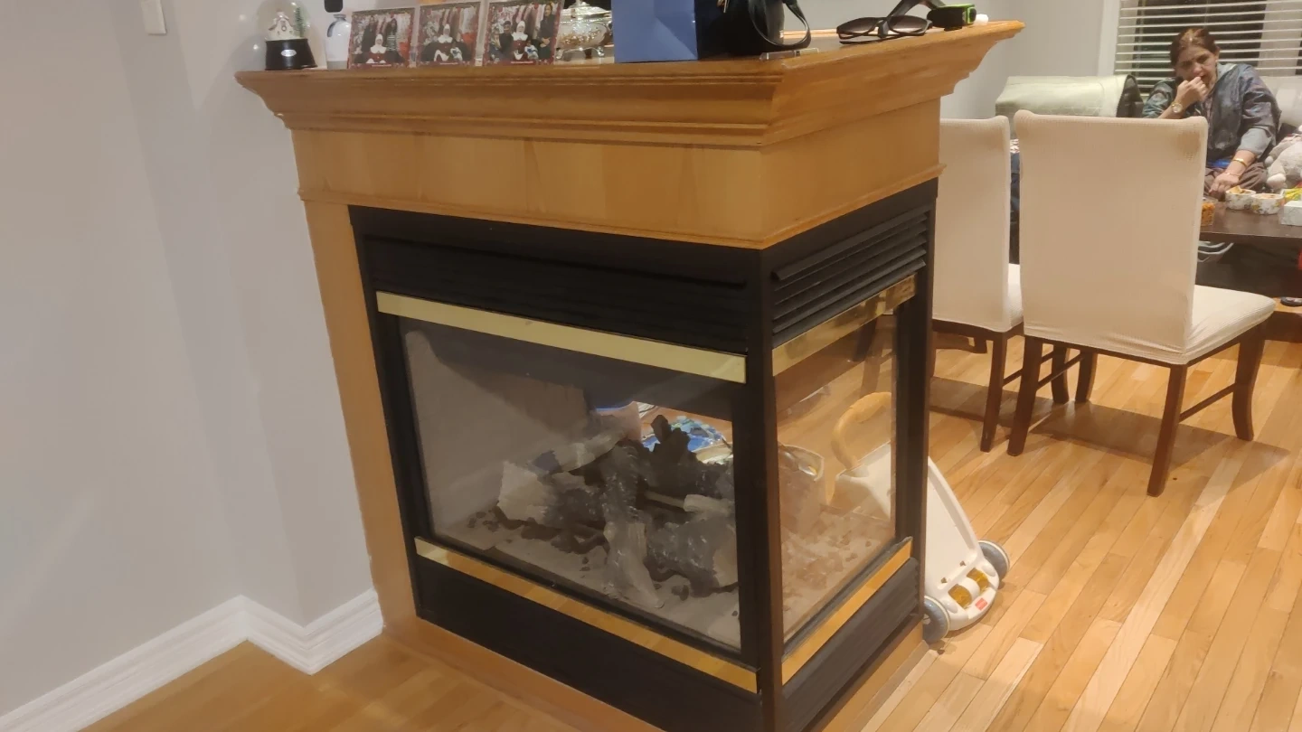 This gas fireplace insert comes with a light oak mantle. It features a glass front with a gold trim accent. It's ready to be installed and bring warmth to your space., hi all , I am going to detached this fireplace from the floor. No more need . It is Works well. Last Day is coming long weekend.. 3 to 5 April. If someone needs let me know. Price don't know. Pick-up only L5W1X5