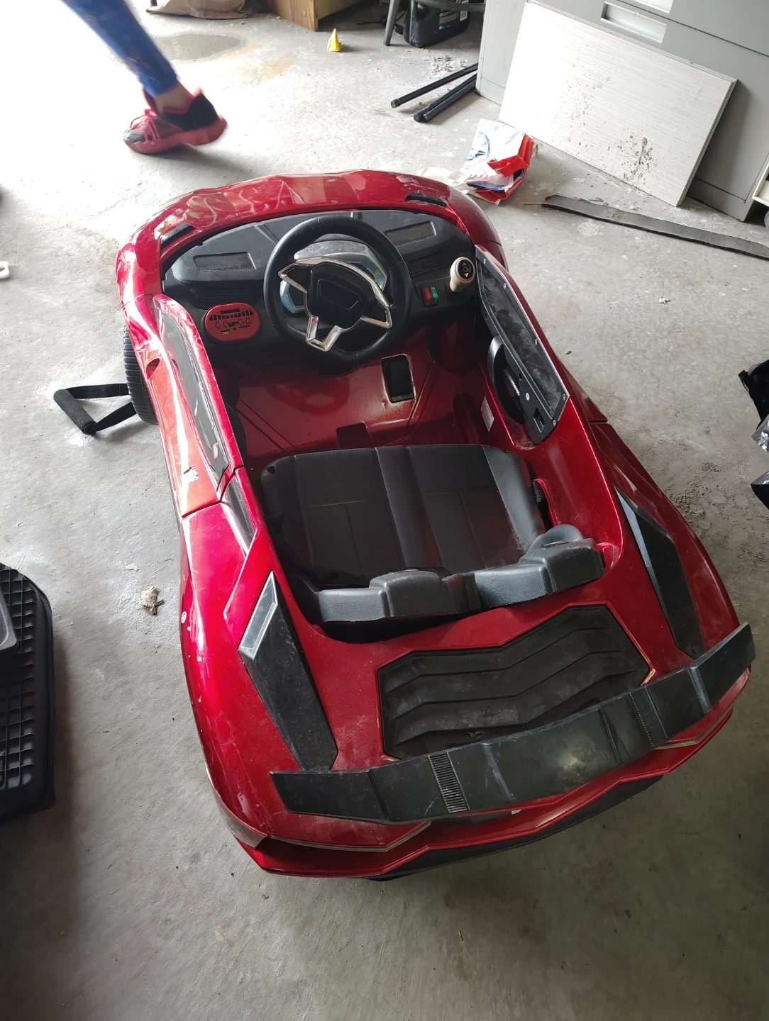 This is a shiny red ride-on sports car, perfect for young drivers. It features a realistic steering wheel and interior controls. Its durable plastic construction is built for fun and adventure! Currently not working new battery required