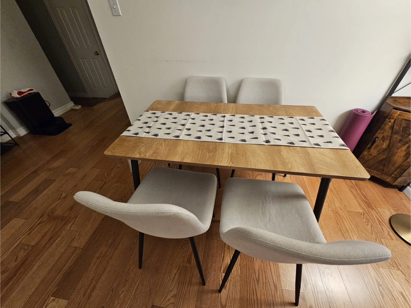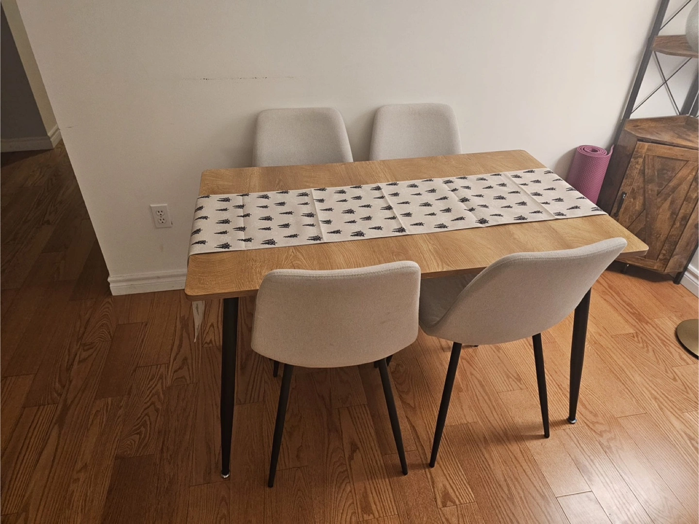 Selling a dining table which is in great condition and would be perfect for a small dining space or kitchen nook. The table has a light wood-look top and black legs.