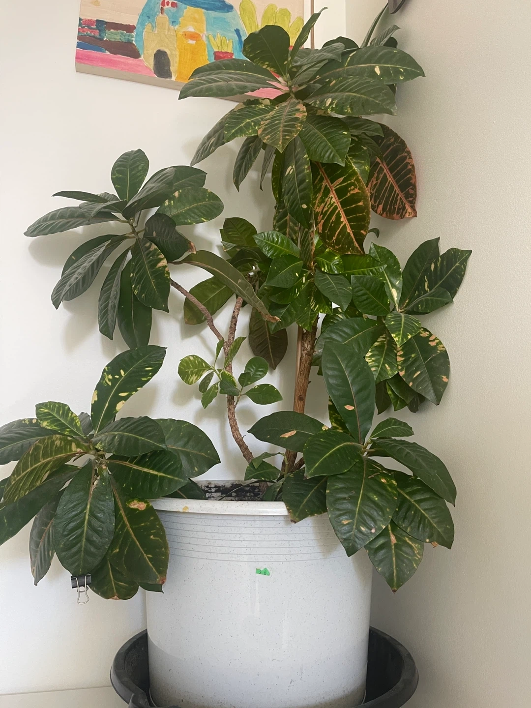 Beautiful indoor plant with variegated leaves. It's potted in a large white container. This plant would add a lovely touch of greenery to any room!