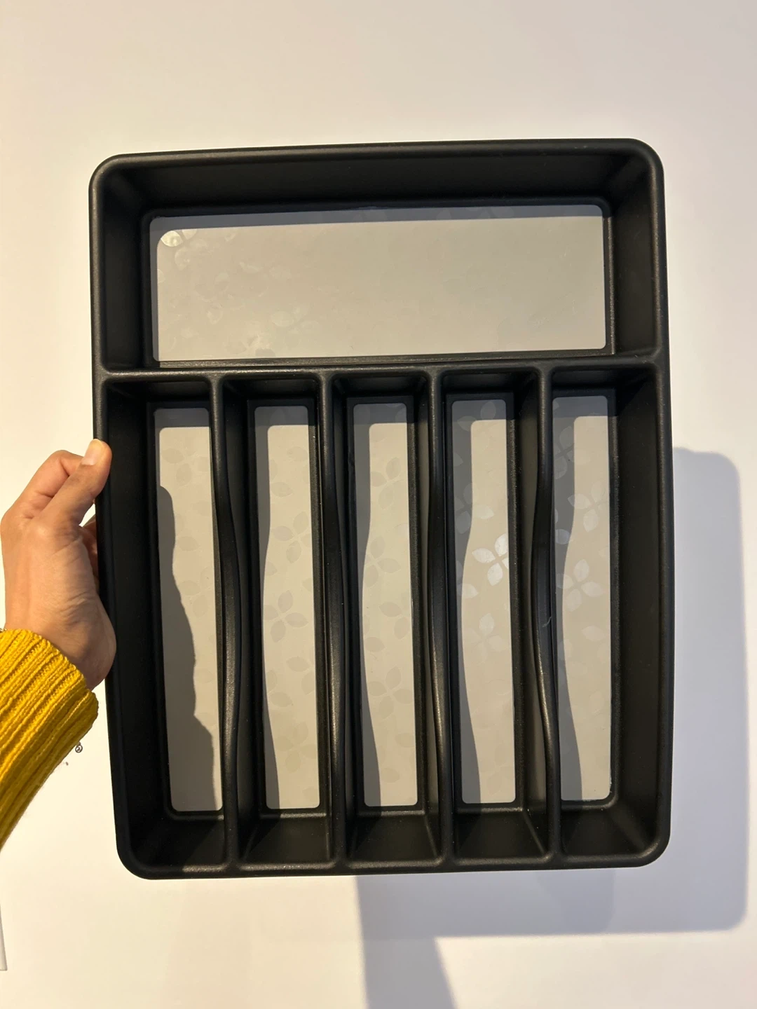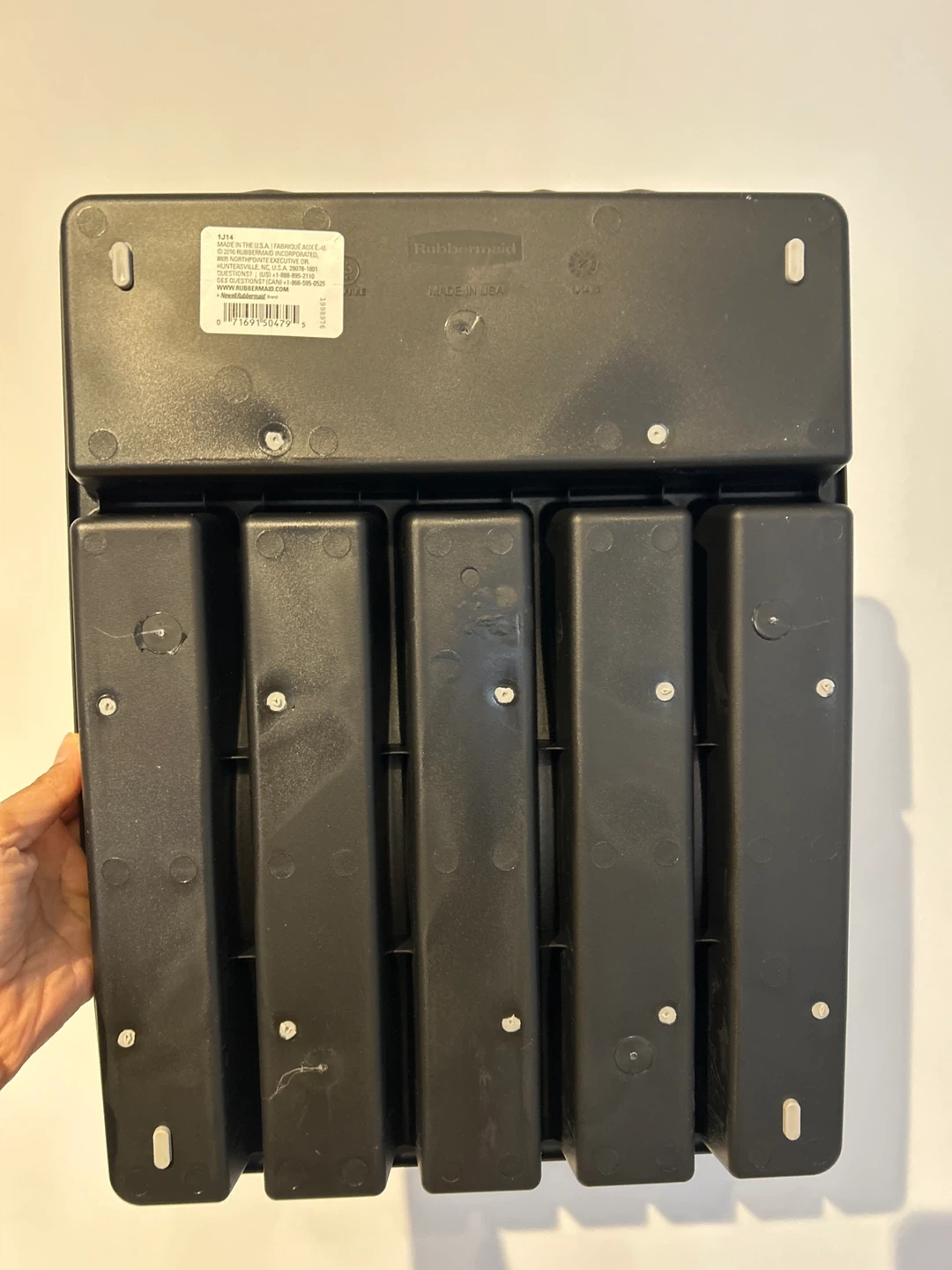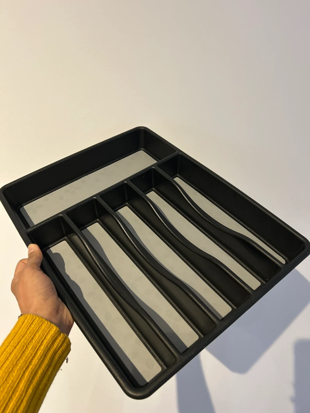 This is a Rubbermaid Large Cutlery Tray. It's black with grey inserts. The tray features a no-slip design. It measures 1.9 x 11.89 x 15.1 inches.