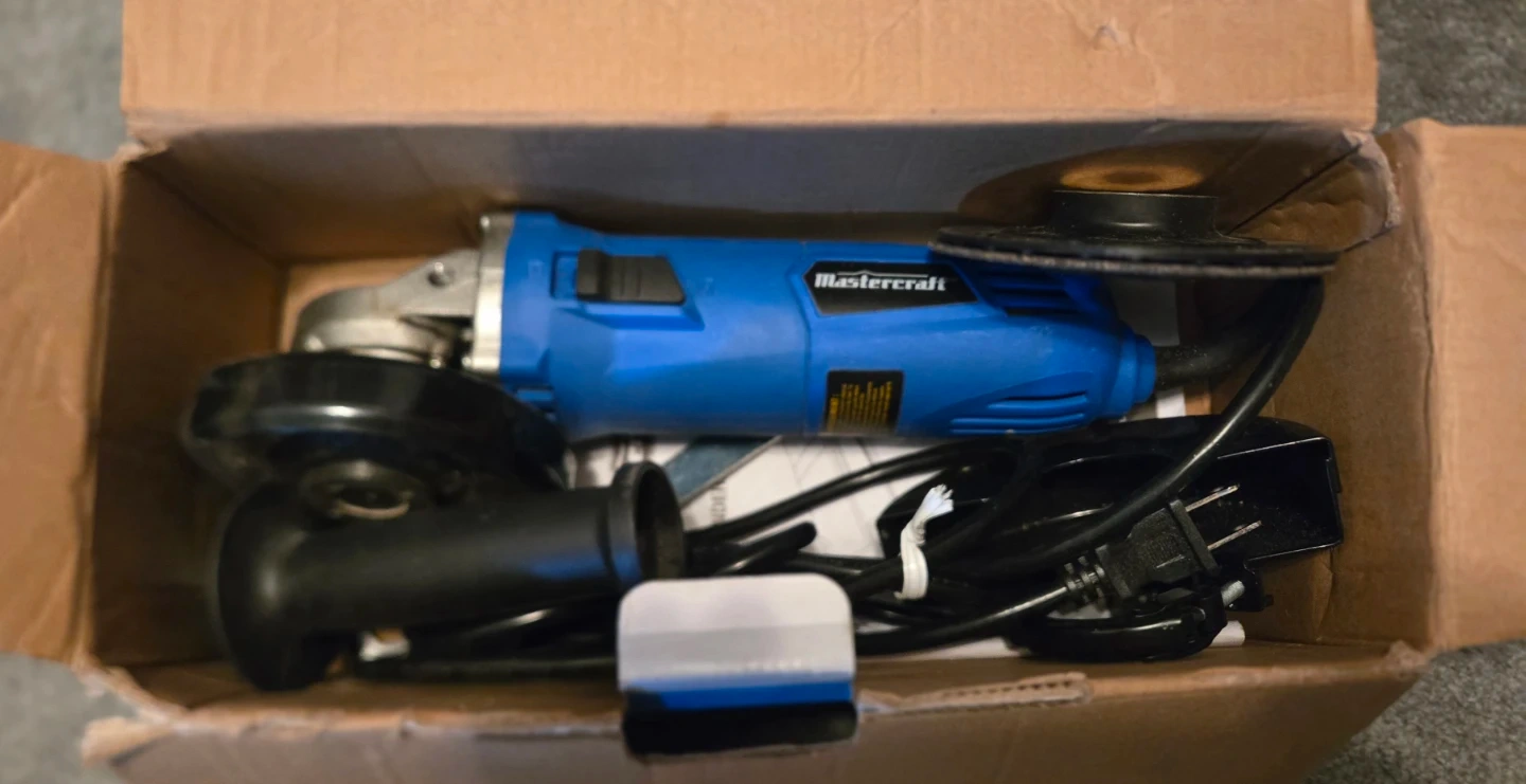 This Mastercraft angle grinder comes with a 6 Amp motor and a 4 1/2" cutting capacity. It includes an extra handle and a disc. It's still in its original box, which shows some wear.