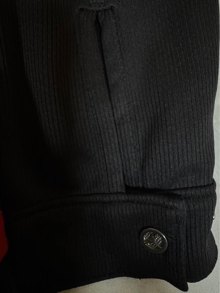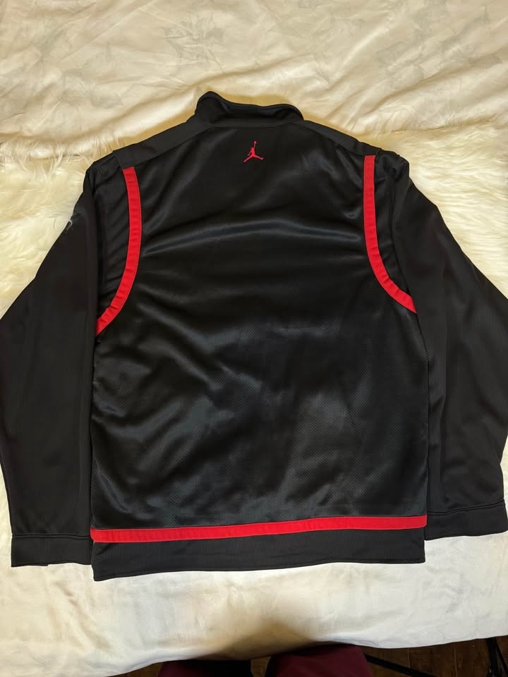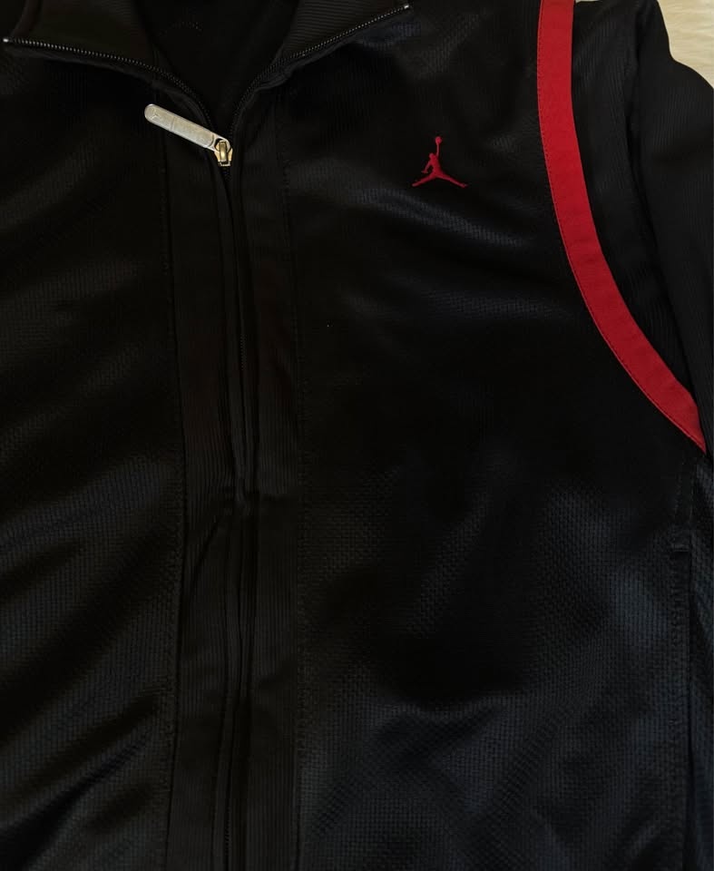 Clean black Jordan full-zip track jacket with red stripes and the iconic Jumpman logo. Comfy material, great for everyday wear or working out.