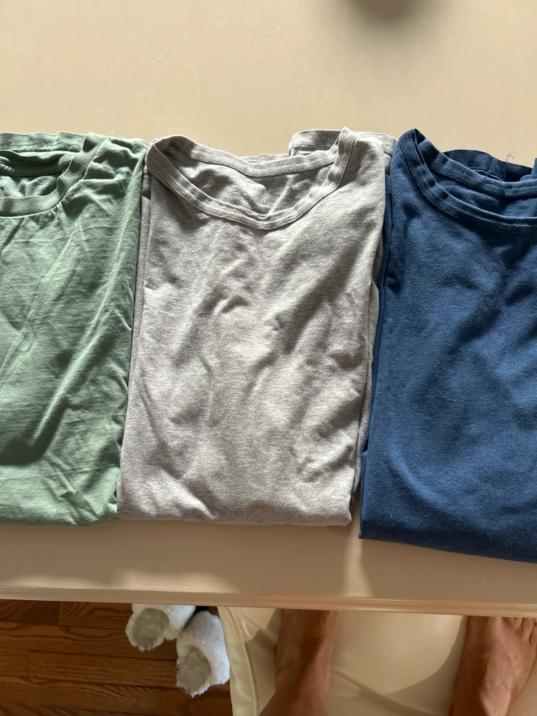Selling a set of t-shirts in various colours: green, grey, and blue. They're in great shape and ready for a new home! The blue and the gray are large and the green is an extra large, but a small extra large,