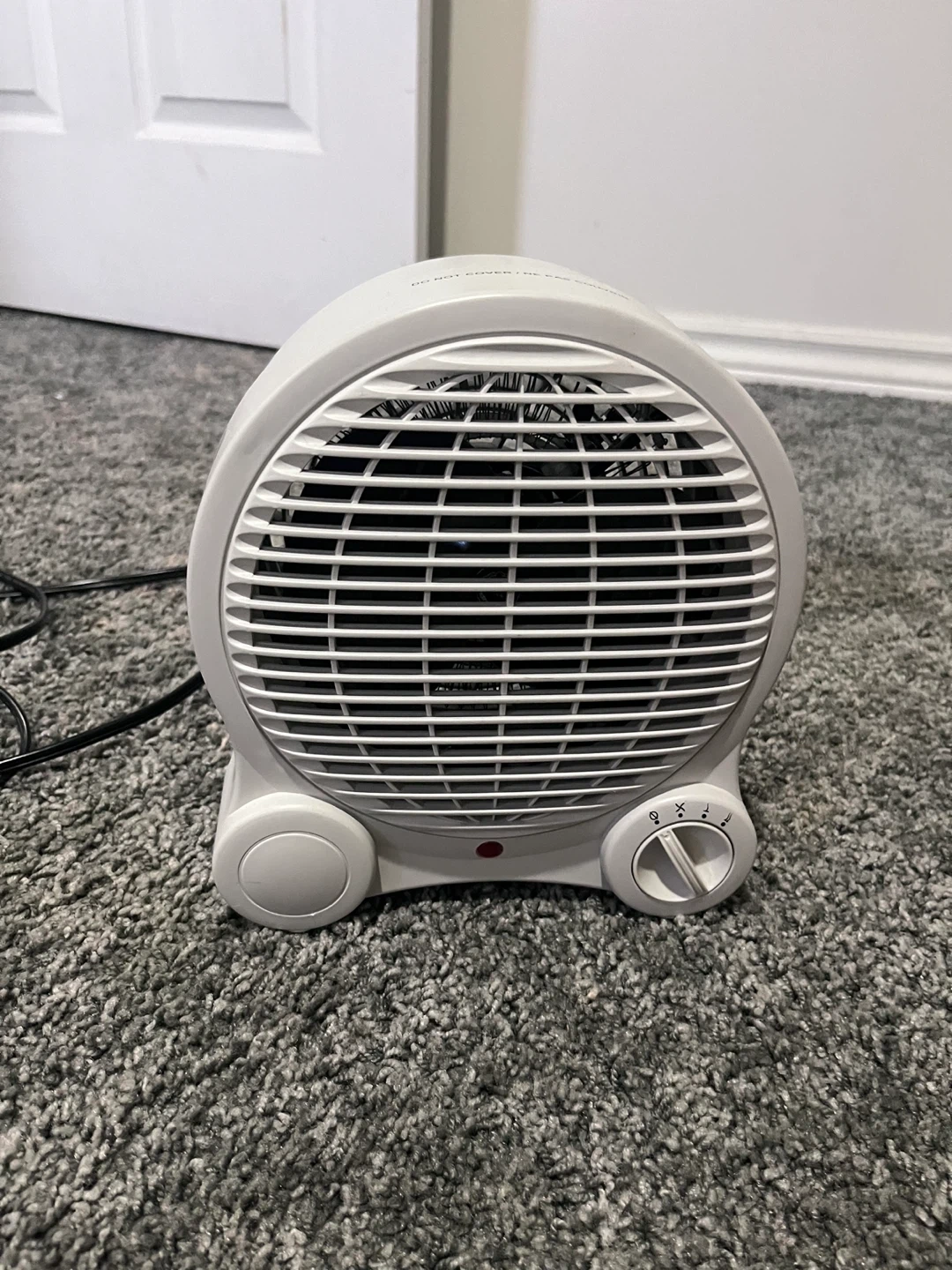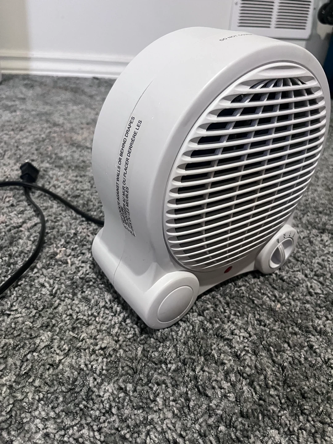 Compact white electric heater, perfect for small spaces. Features multiple heat settings controlled by a dial. Its portable design makes it easy to move between rooms.