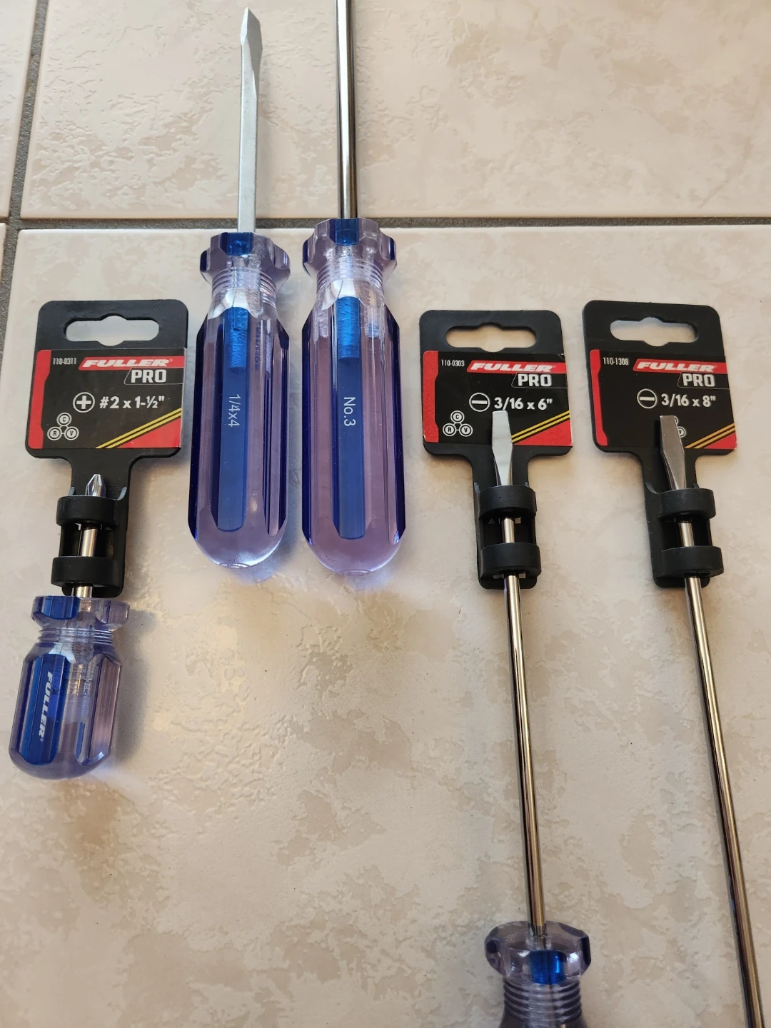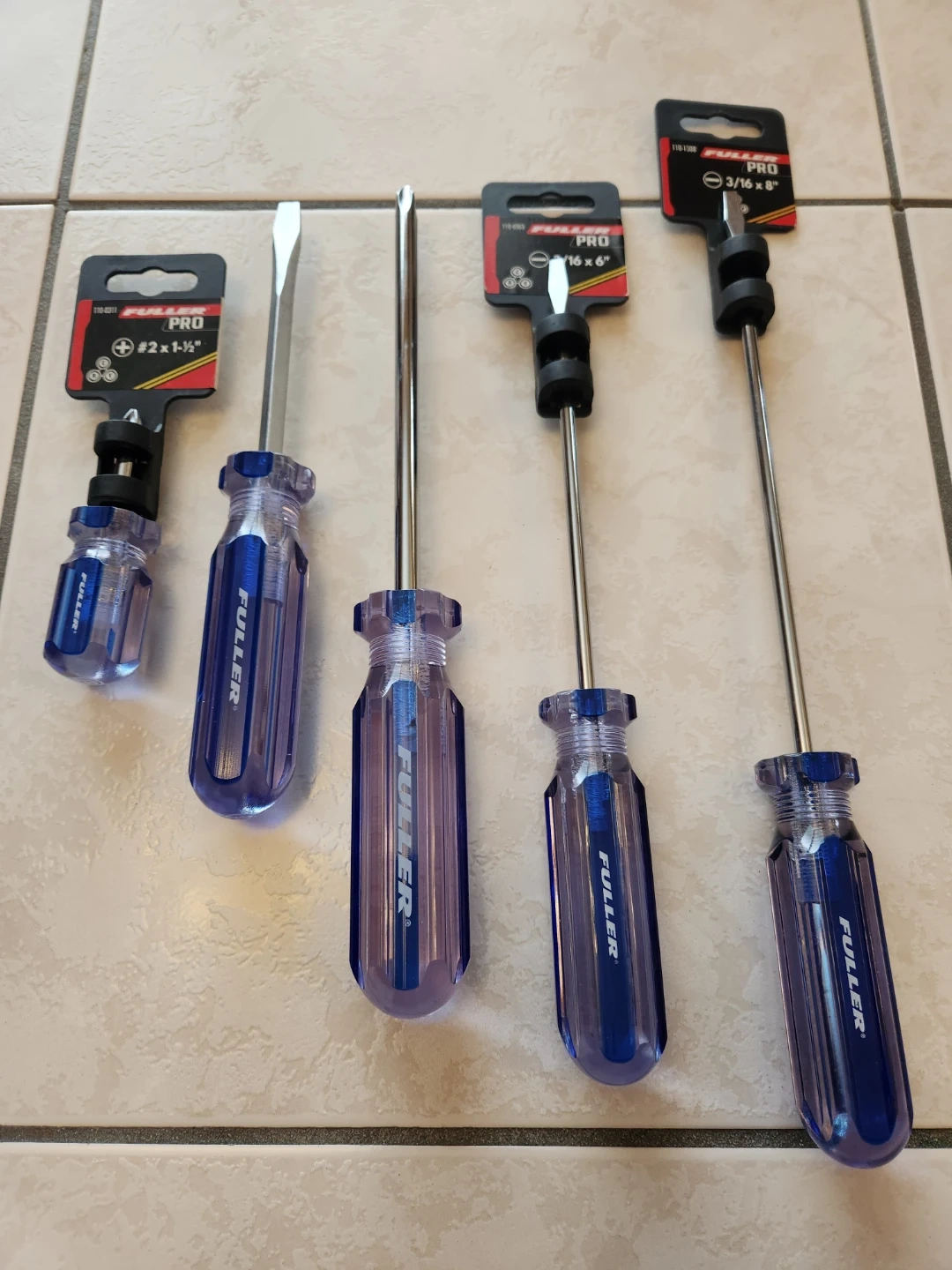 This is a set of Five Fuller PRO screwdrivers. Includes two Phillips head and two flat head screwdrivers in various sizes. They feature clear blue handles and steel shafts. Handy for various household repairs!