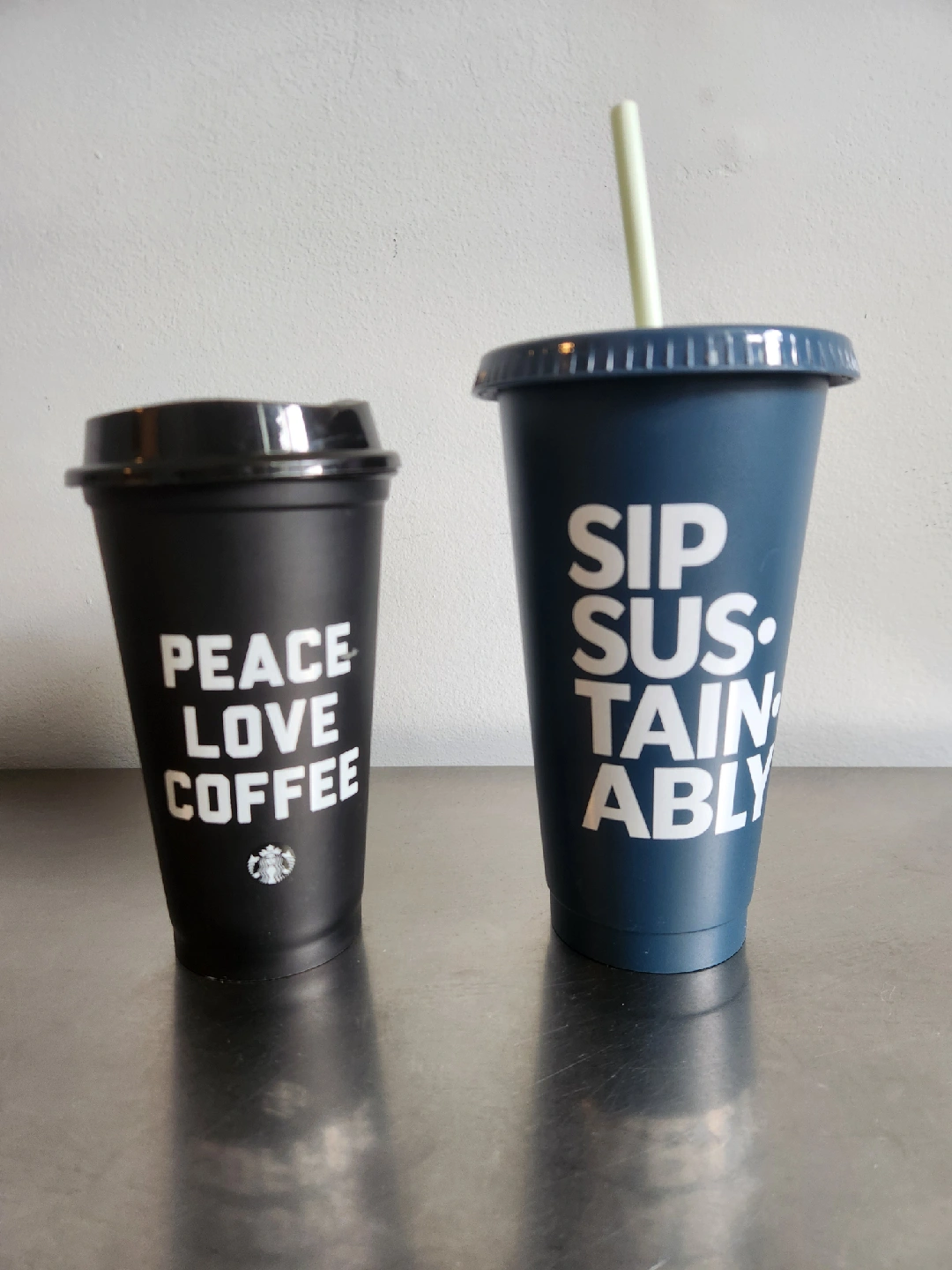 Two Starbucks reusable cups for sale! One is a black hot cup with the words 'Peace Love Coffee' and the other is a blue cold cup with a straw and the words 'Sip Sustainably'. Both are in great shape and ready for your favourite drinks