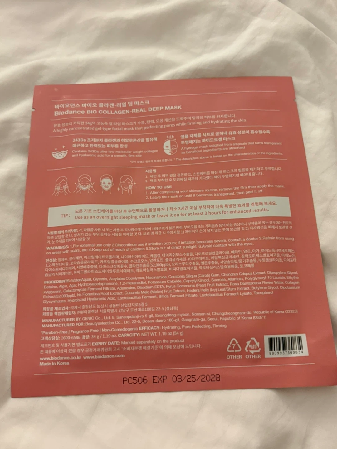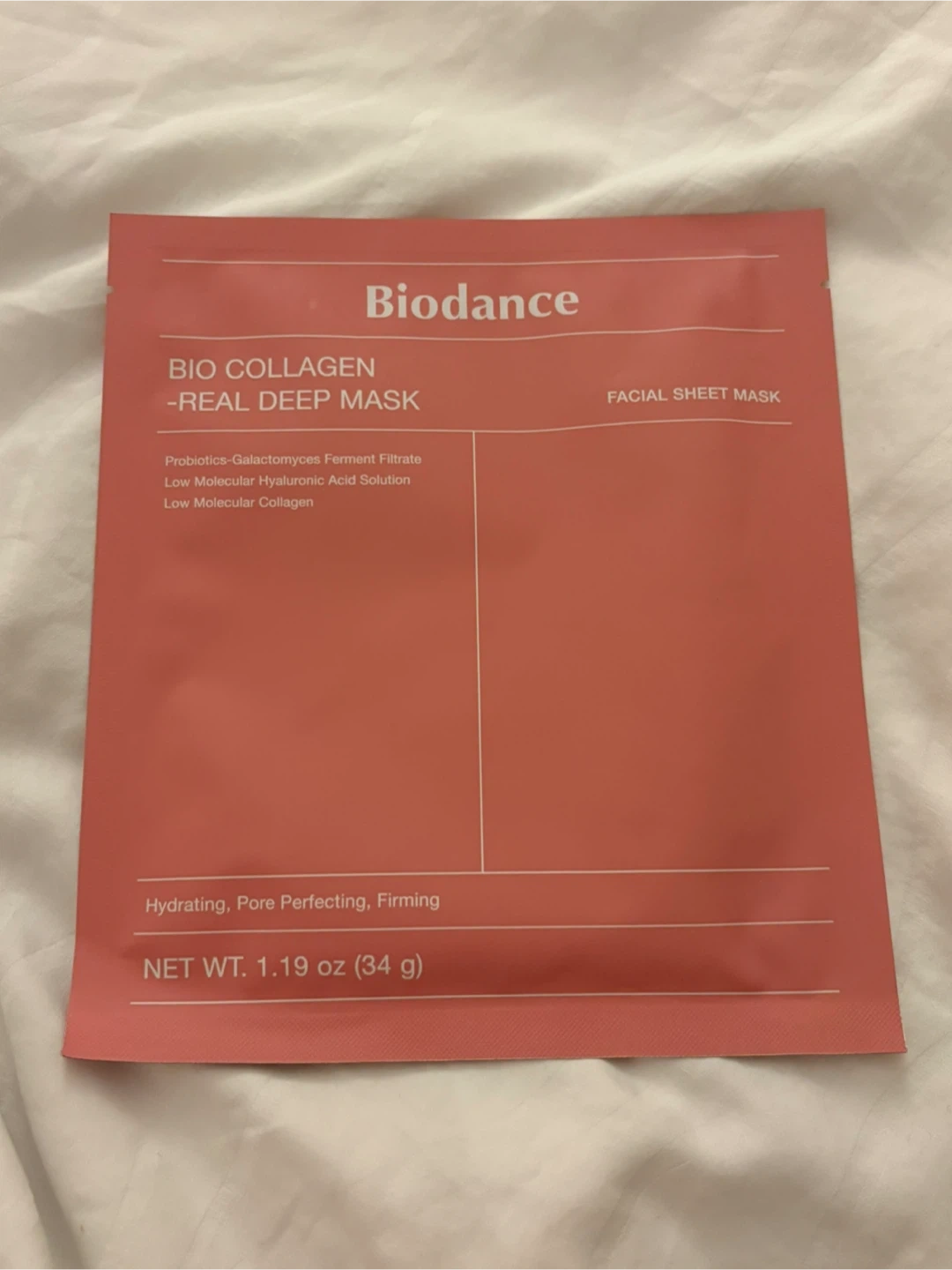 This facial sheet mask provides intense hydration and pore perfecting with low molecular collagen and hyaluronic acid. It's formulated to help firm the skin. Use it for a refreshing skincare treatment. This mask is a single application.