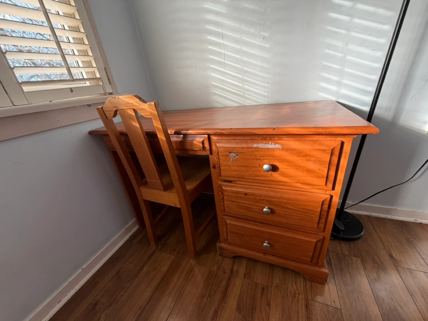 This is a wooden desk with a matching chair. It has a light brown wood finish and features three drawers on the right side with silver knobs. The desk surface has some minor wear. It's a good size for a home office or study area.