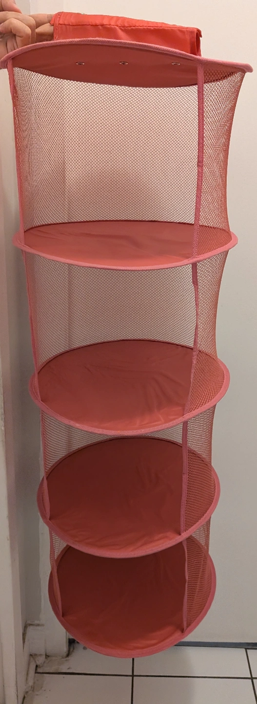Four-tiered hanging organizer. Salmon pink colour. Mesh sides and fabric shelves. Great for closet organization.