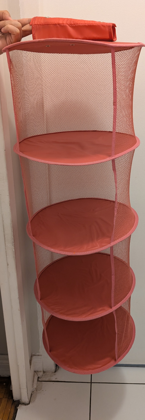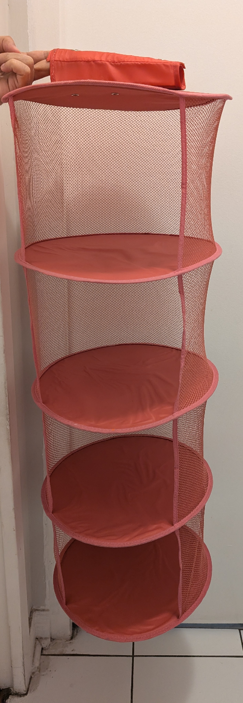 Four-tiered hanging organizer. Salmon pink colour. Mesh sides and fabric shelves. Great for closet organization.