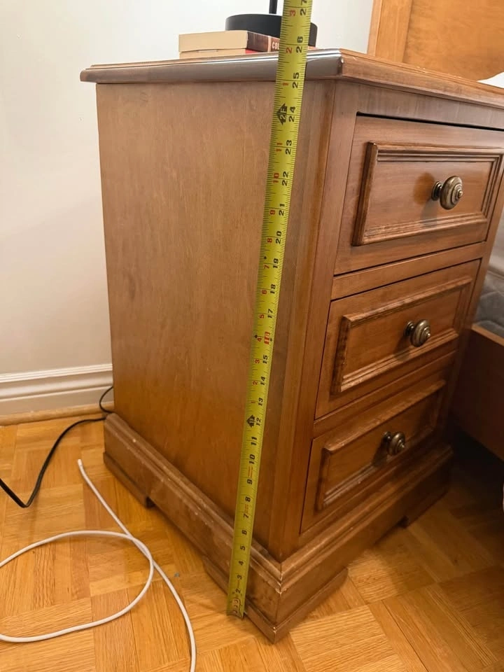 Solid wood oak bed frame and nightstand in brown tone stain finish. Bed frame is 8 inches tall. Nightstand is 27 inches tall with 3 drawers. In great condition.