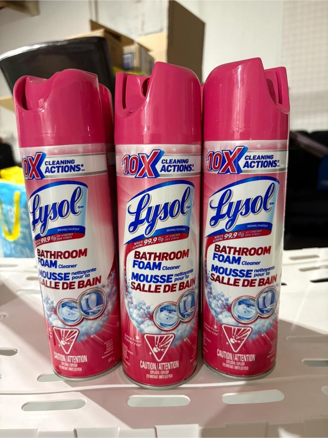 Three cans of Lysol Bathroom Foam Cleaner. It's a foam cleaner for bathrooms that kills 99.9% of viruses and bacteria. Great for cleaning tubs, tiles, and sinks!