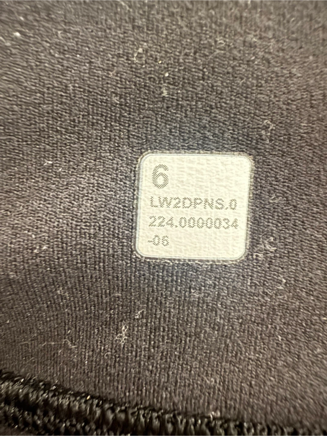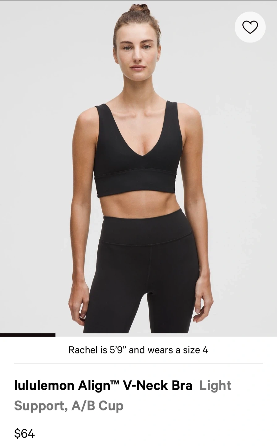 This is a black Lululemon Align V-Neck Bra in size 6. It's designed for light support and A/B cups. The material is soft and comfortable for everyday wear.
