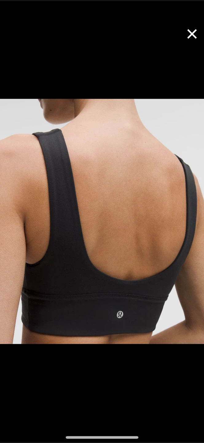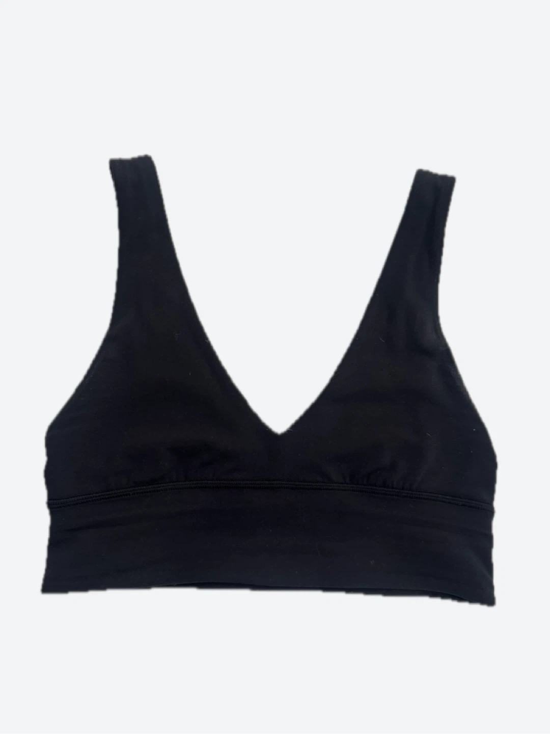 This is a black Lululemon Align V-Neck Bra in size 6. It's designed for light support and A/B cups. The material is soft and comfortable for everyday wear.