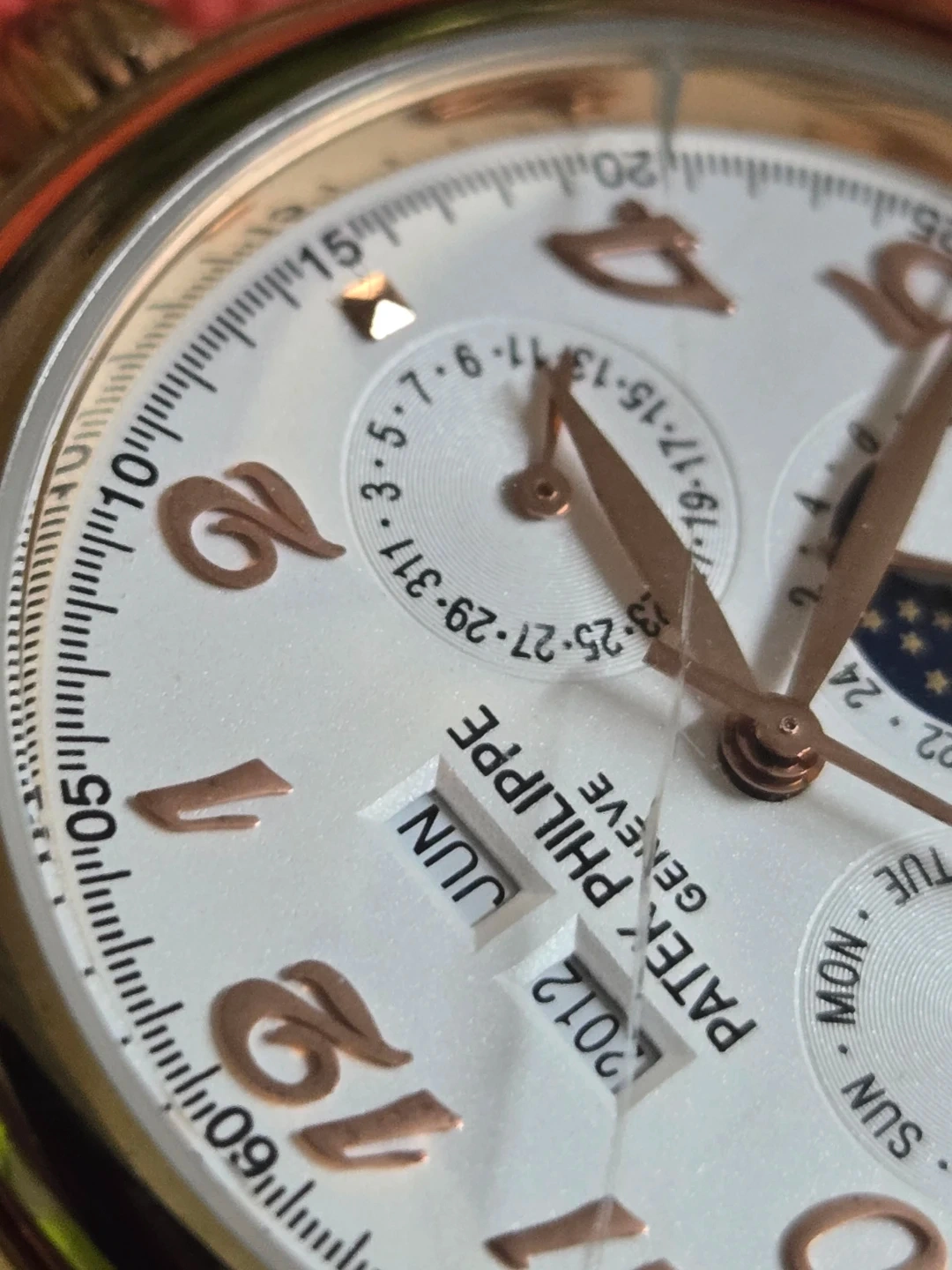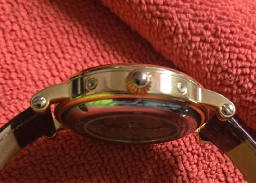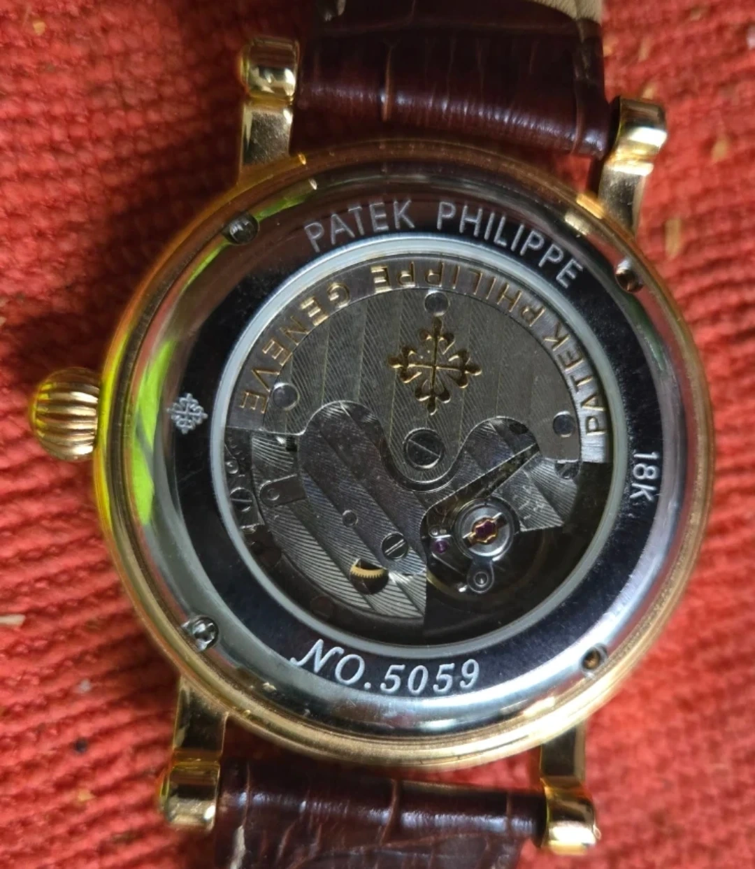 Selling a Patek Philippe watch with a brown leather strap. The strap is made of genuine leather. The watch has a gold / white gold case and buckle. The back of the watch has the number NO.5059 on it aswell as 18k