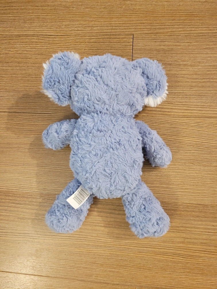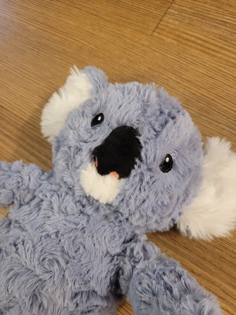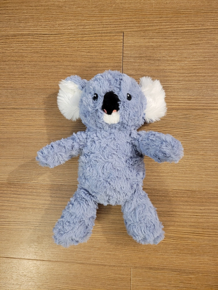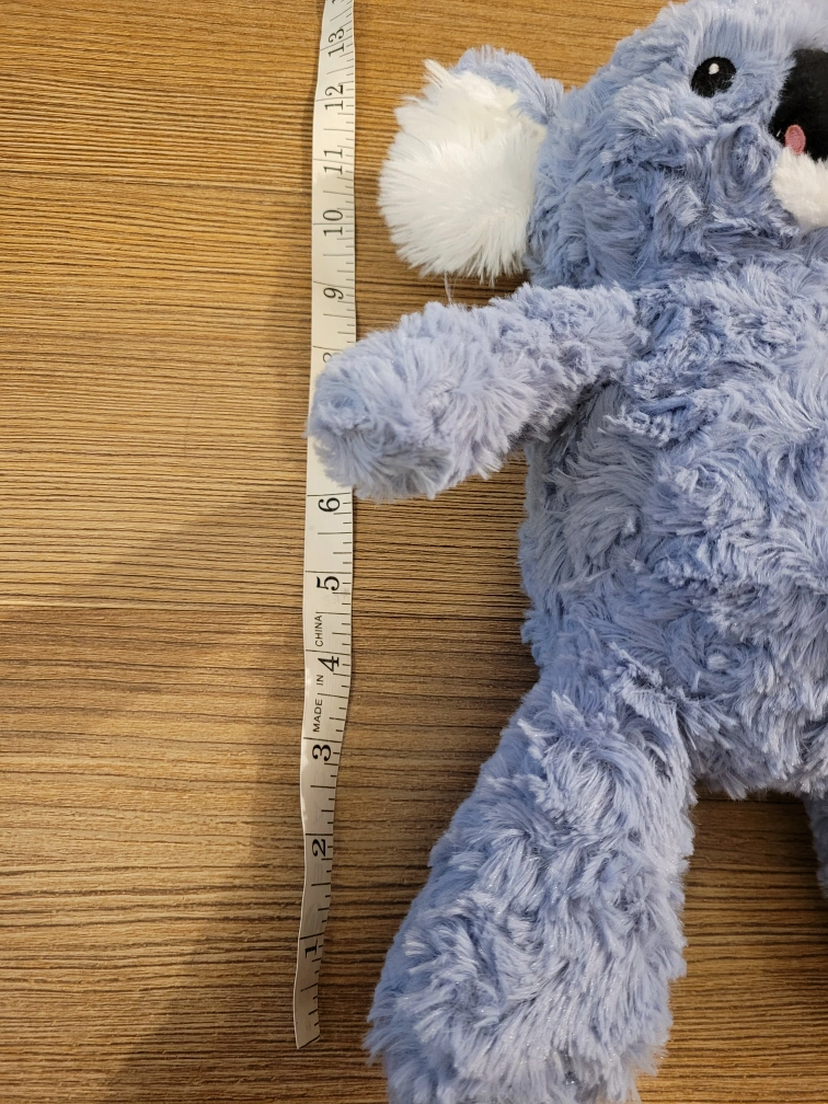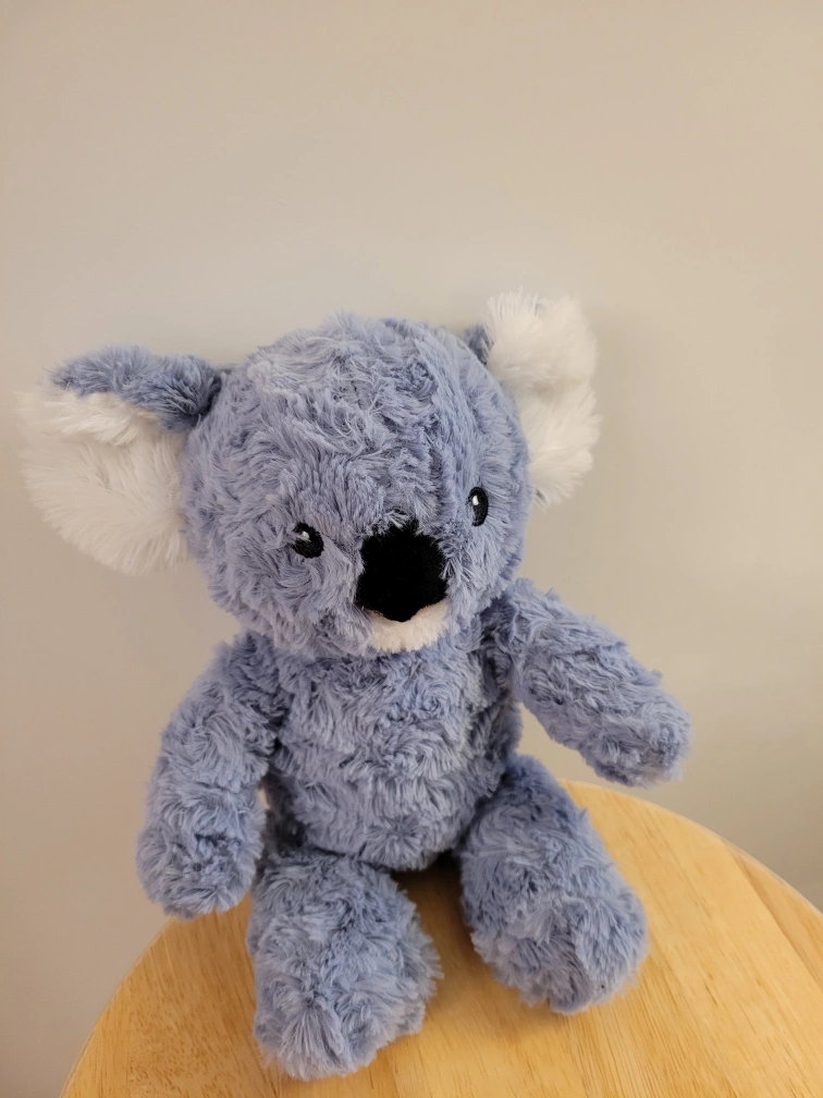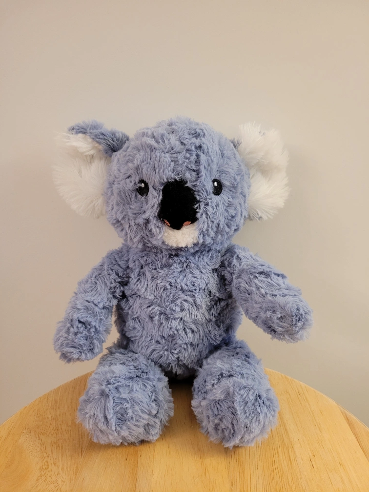 A plush koala with fluffy blue fur. Features big ears with white fluffy accents. Its face has a black nose with a white mouth. This koala would make a lovely addition to a child's collection for comfort. From smoke and pet free home. Approximately 11 & 1/2 inches long.
