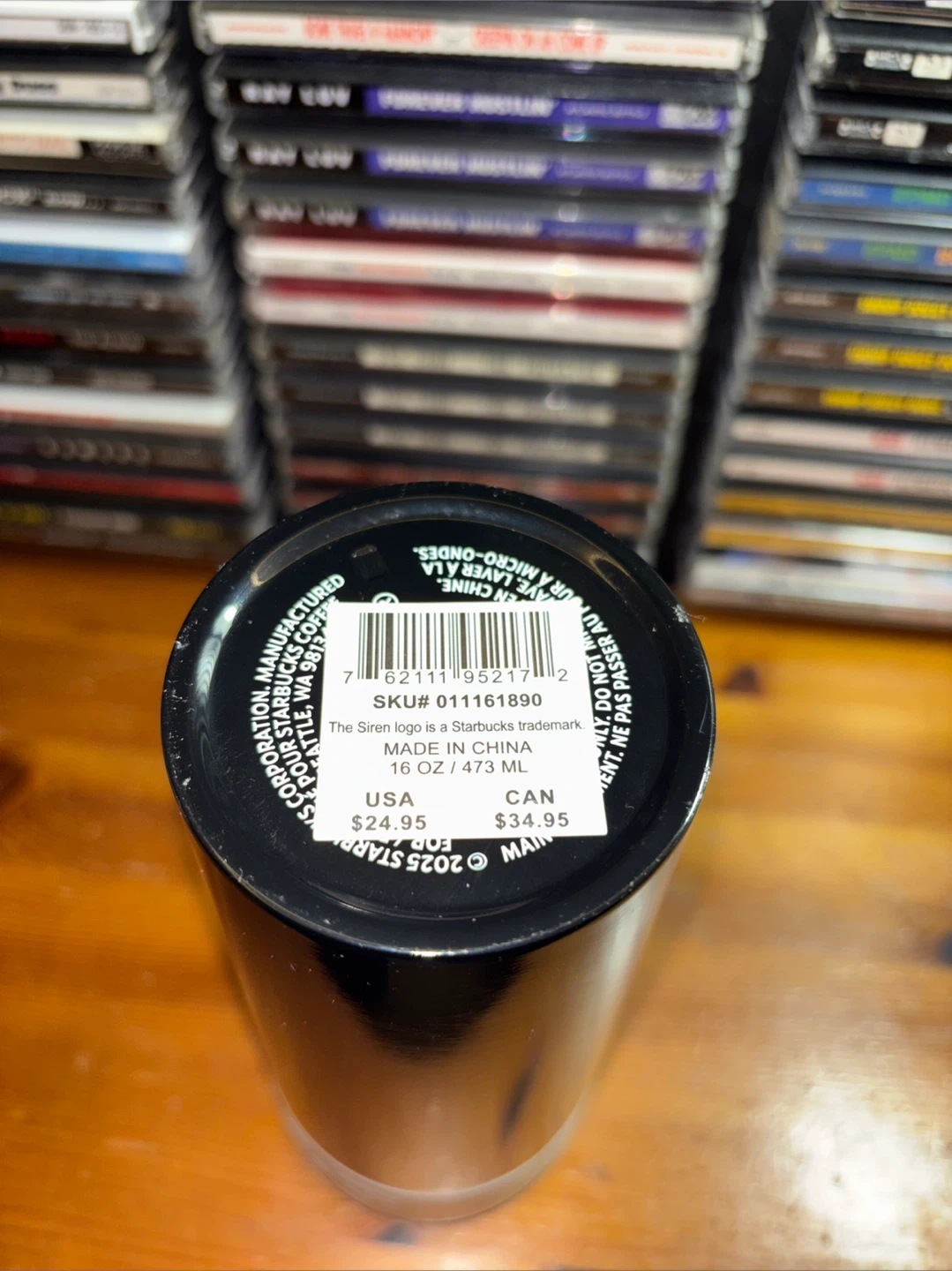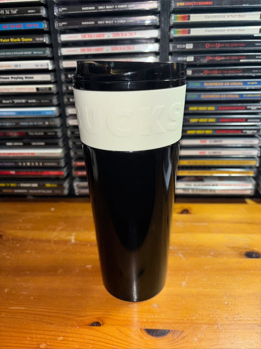 This is a black Starbucks travel tumbler with a white grip band. It holds 16 oz or 473 mL. It's made in China. Comes with a black lid.