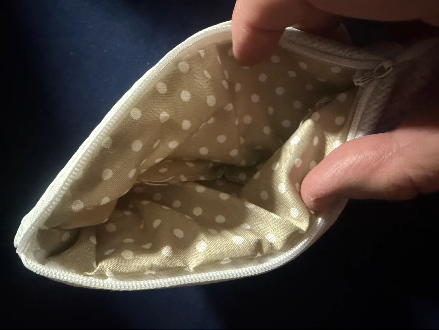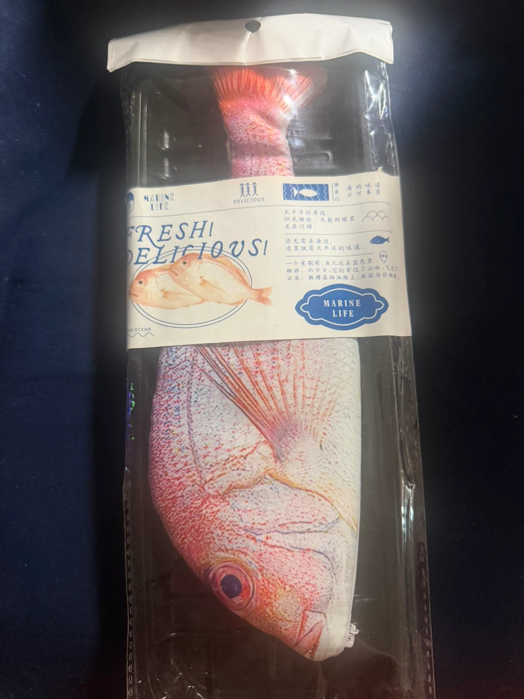 This pouch is designed to look like a fresh fish, with a realistic print. It's perfect for storing pens, pencils, or other small accessories. The interior has a polka dot lining.
