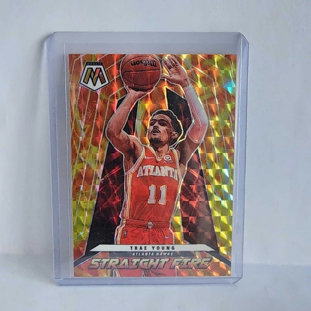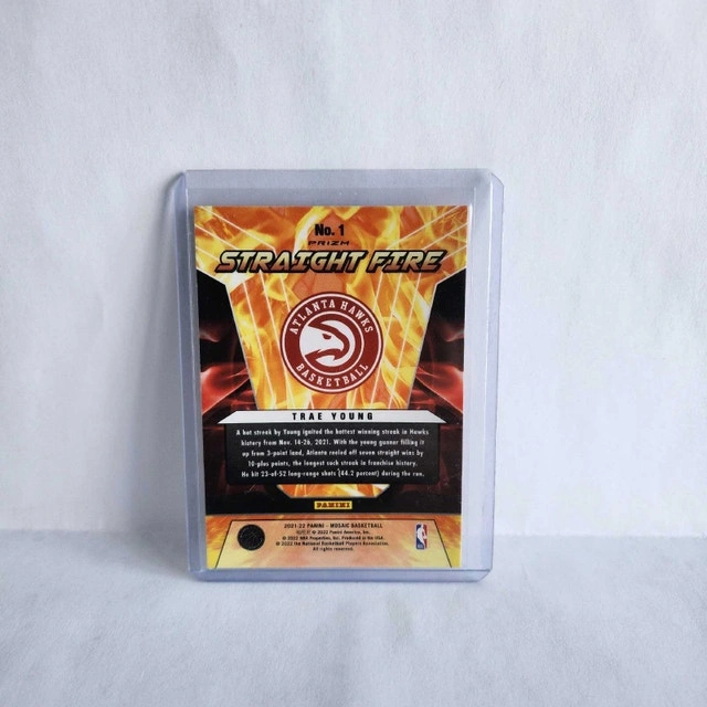 2021 –22 Panini Mosaic Straight Fire insert – Card #1 Trae Young – Atlanta Hawks. Clean card, stored in sleeve and case. Great looking insert. Price: $6 OBO. Pickup in Kitchener. Cash or e-transfer. If ad is up, it’s available. See other listings.