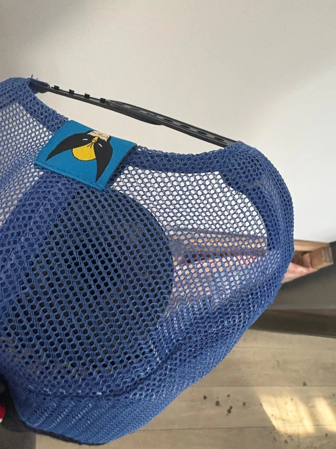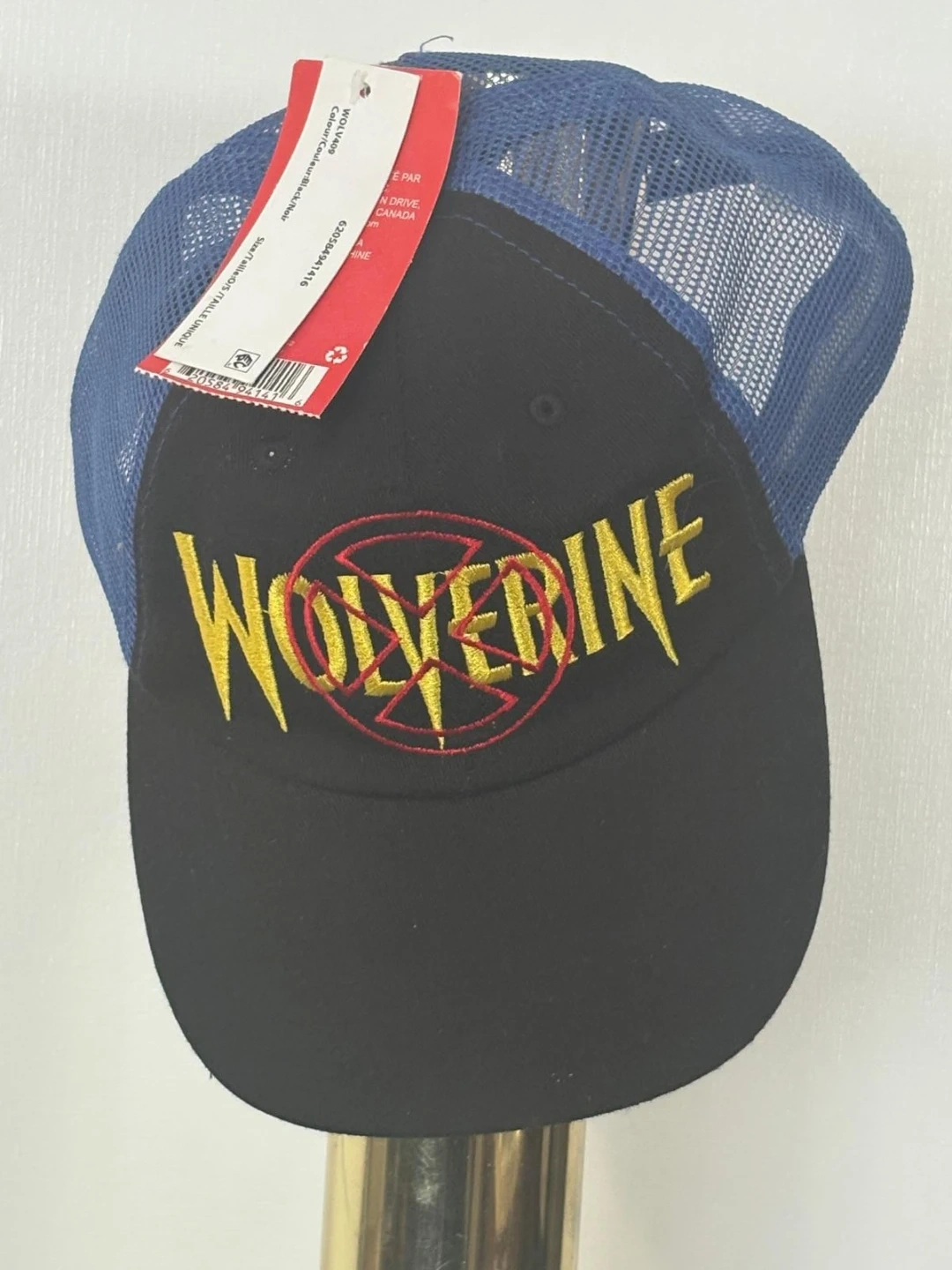 This is a blue and black trucker hat with a 'Wolverine' logo embroidered on the front. It features a mesh back for breathability. Adjustable strap ensures a comfy fit.