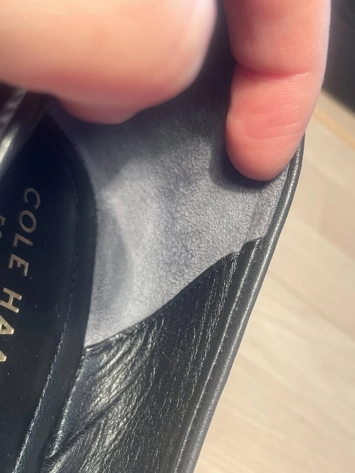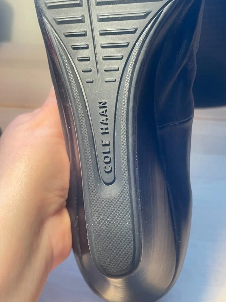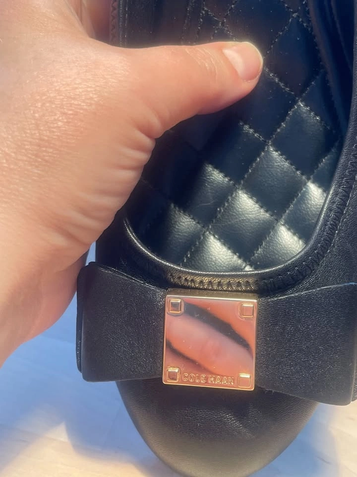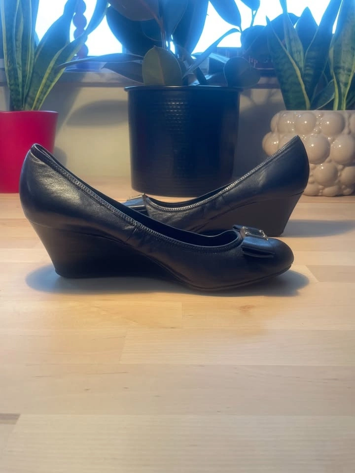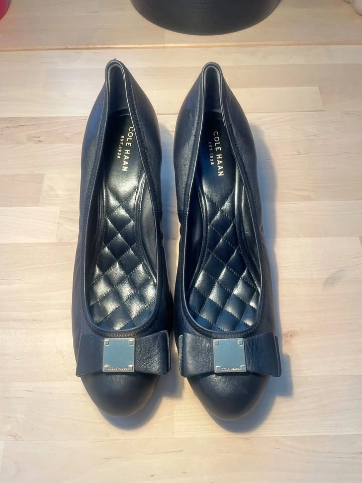 Black leather Cole Haan Tali Grand Bow Wedge pumps, size US 10