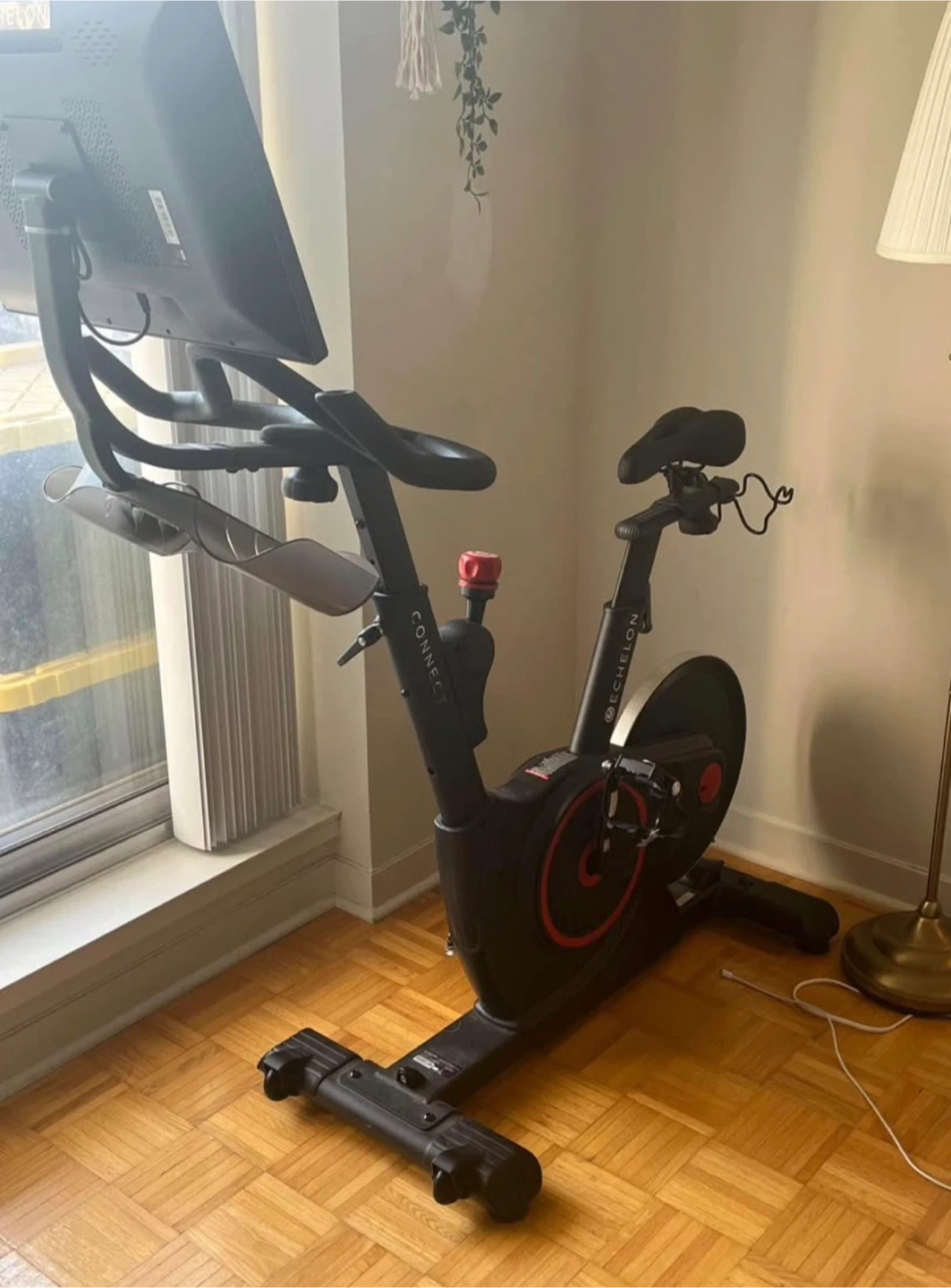 This is an Echelon Connect stationary exercise bike. It features a built-in screen and adjustable seat and handlebars. It's suitable for home workouts.