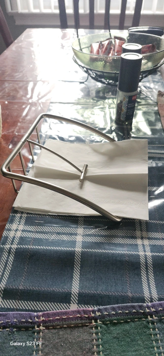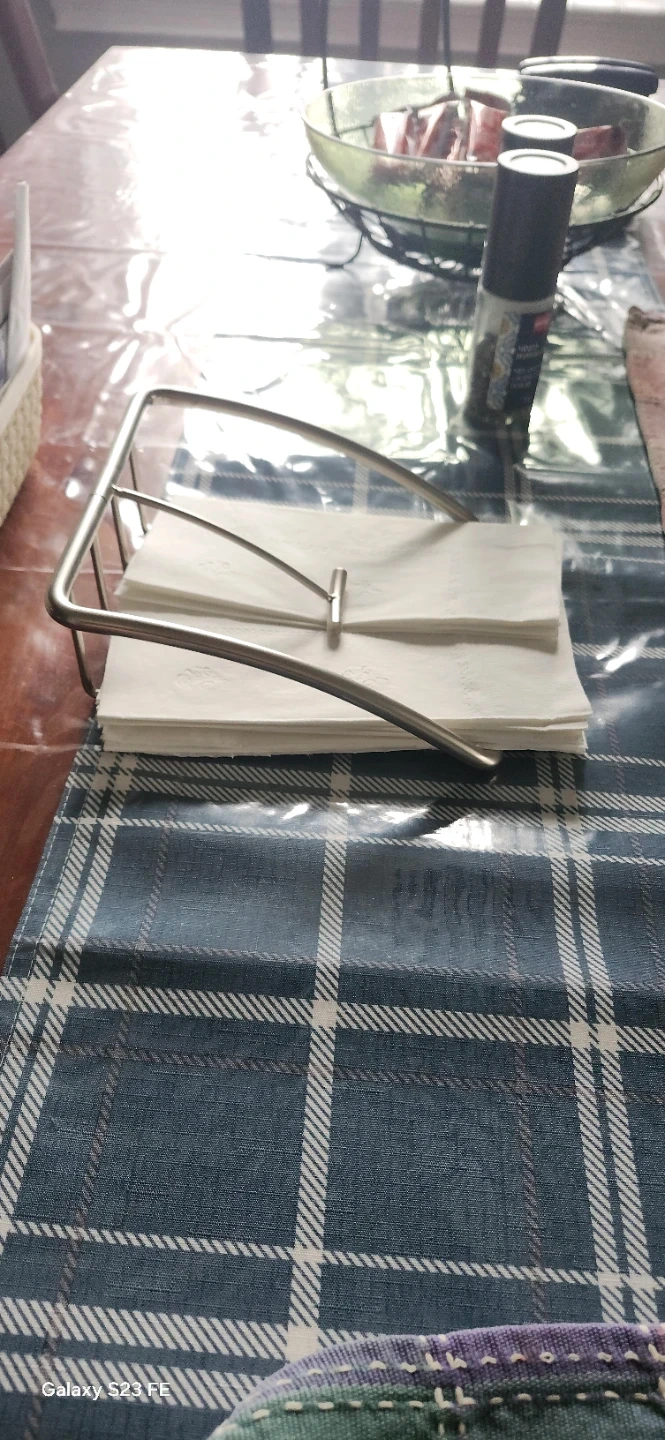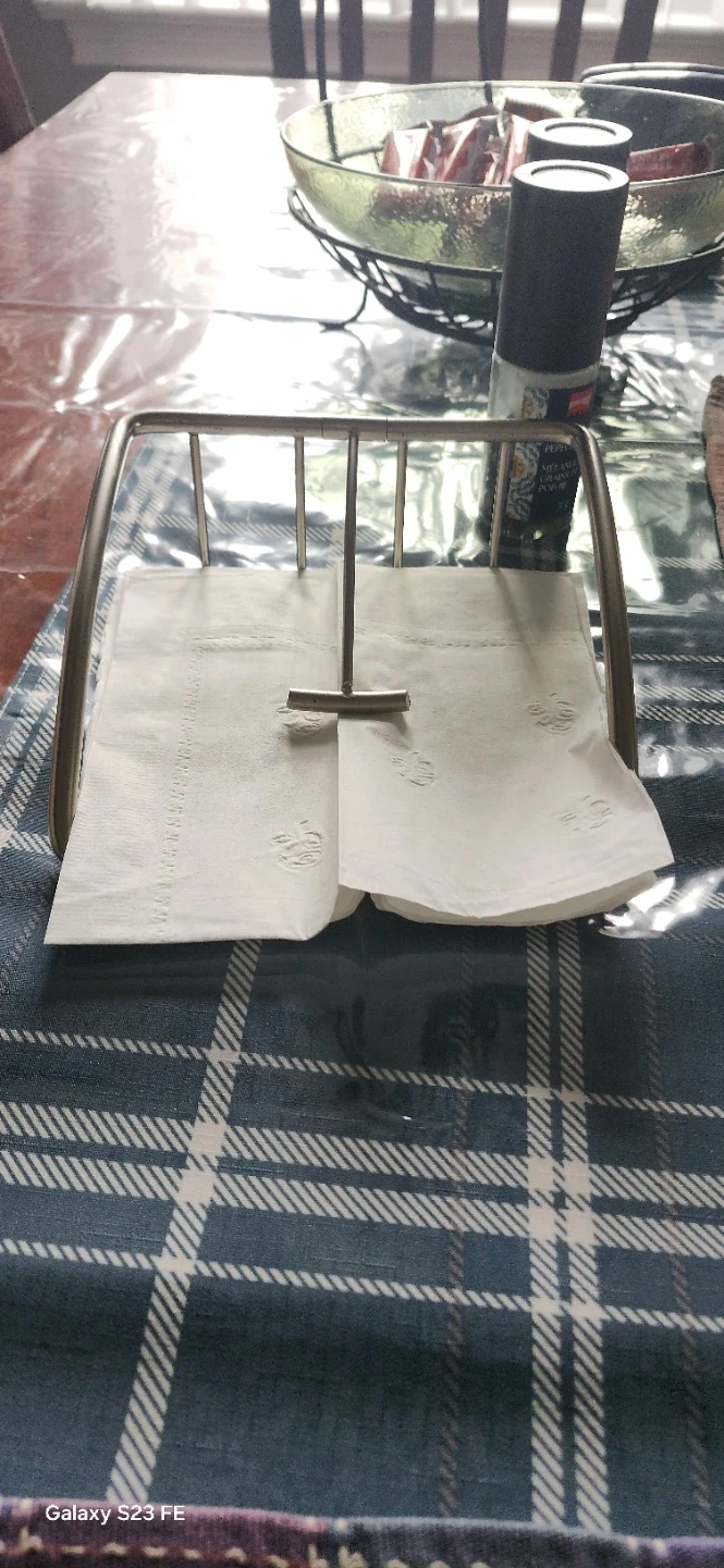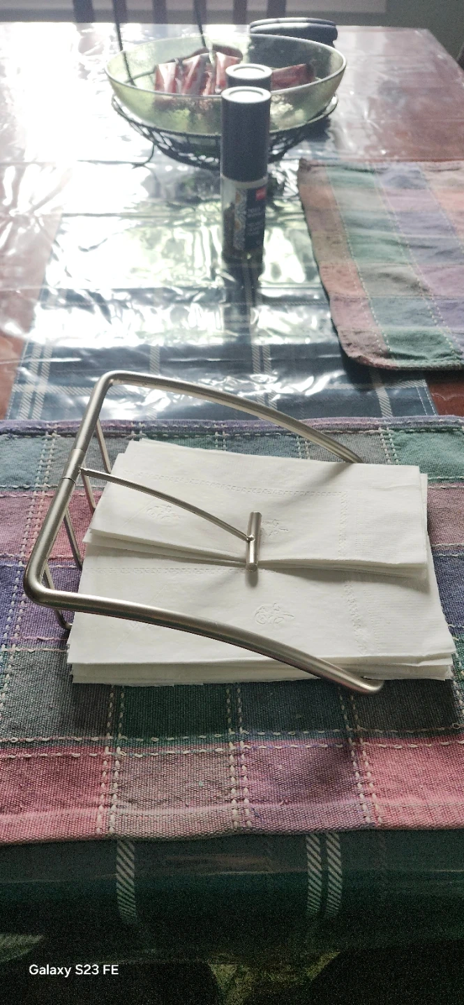This is a metal napkin holder. It's great for keeping napkins tidy on your table or counter. Its simple design fits most decor styles. Price firm only cash only pickup no delivery 801 O'Connor drive outside TD Canada Trust bank door East York
