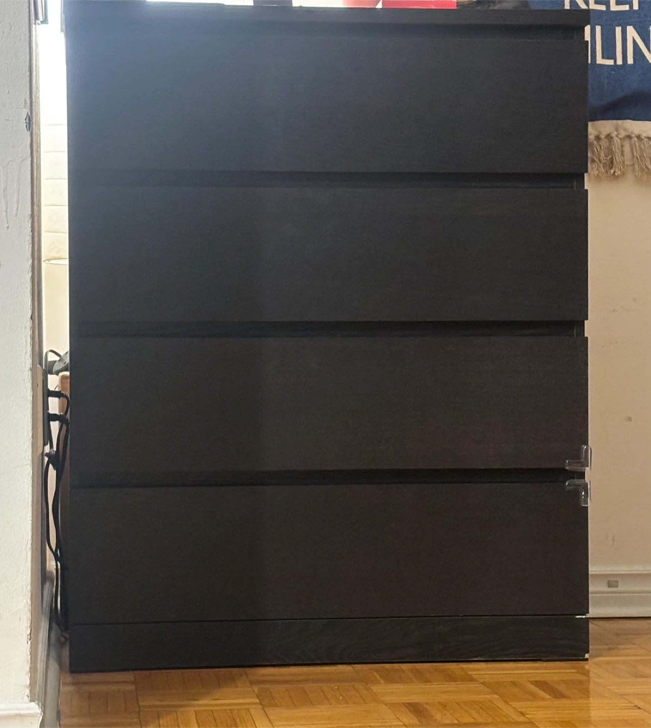 Selling a dark brown dresser. It has four drawers and is in good condition. Perfect for adding some extra storage to your space