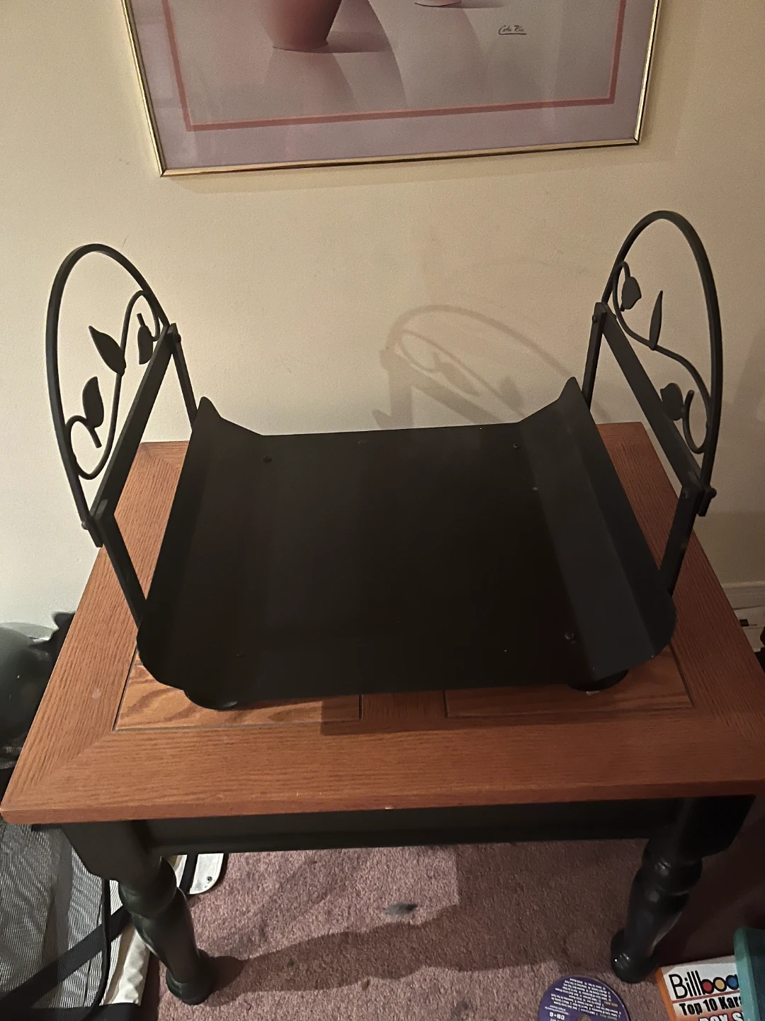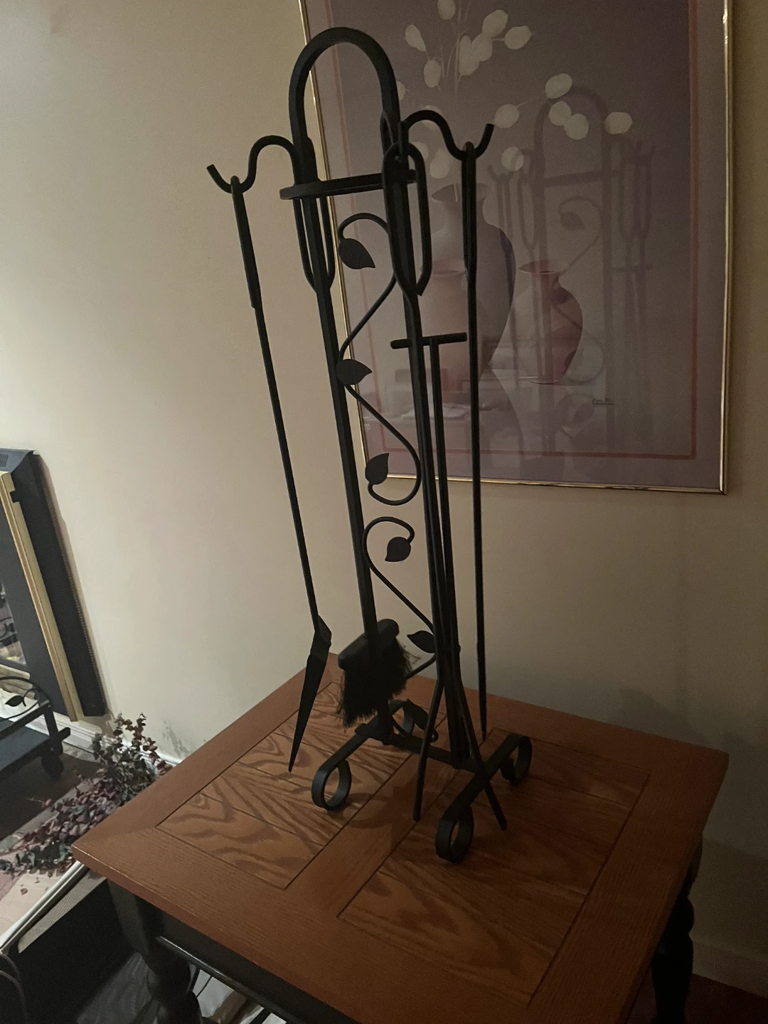Selling a black metal fireplace tool set. It includes a stand and several tools to maintain your fireplace. Perfect for keeping your hearth tidy and your fire burning bright