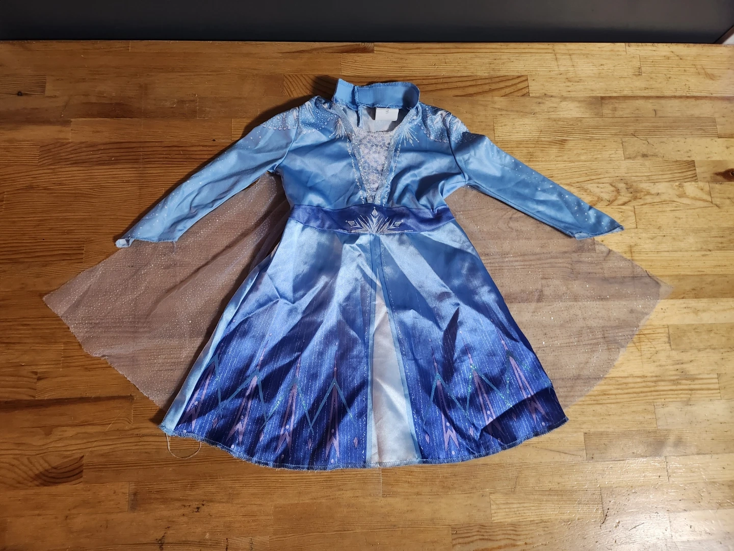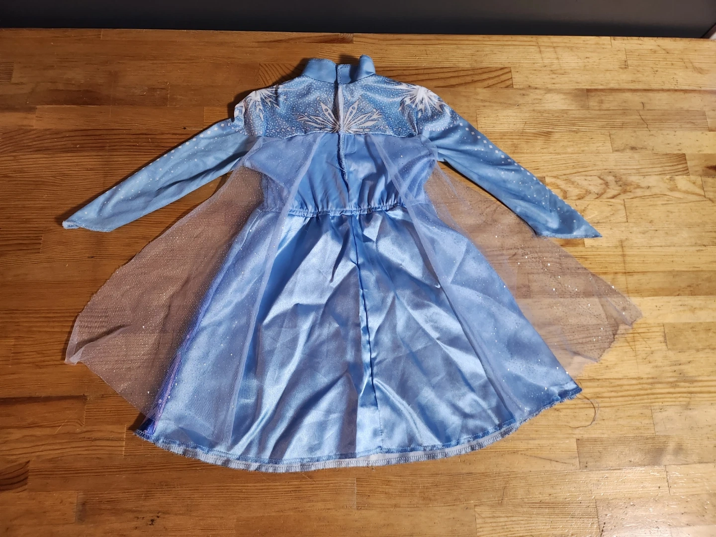 Disney Frozen Elsa dress in size 2T. It's blue with glittery details. The dress is made of polyester.