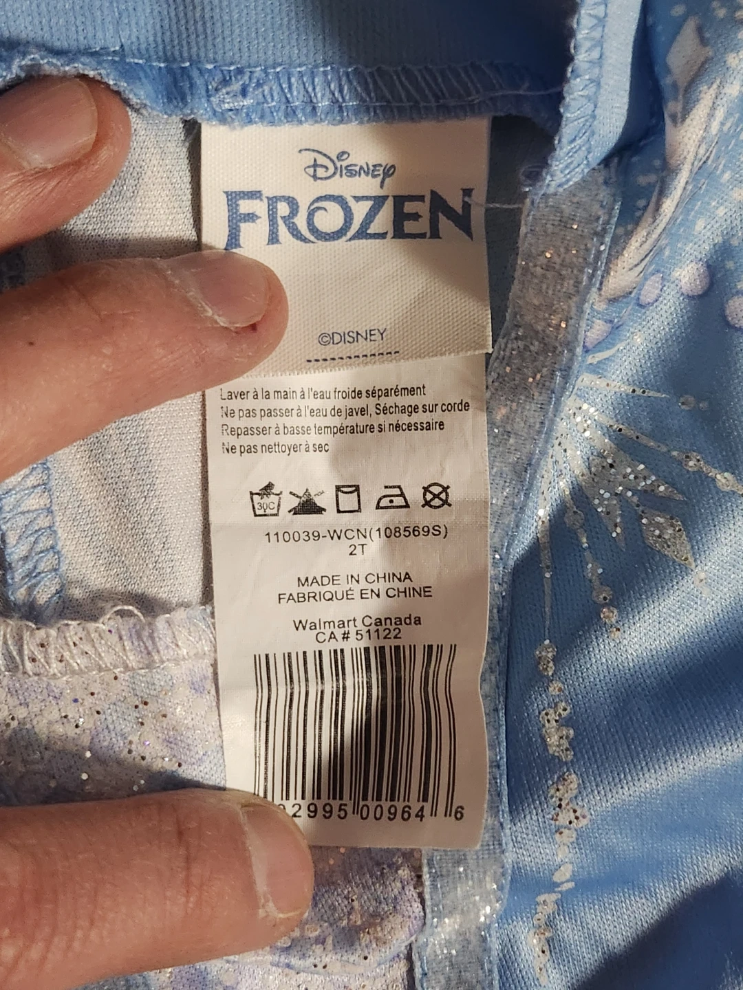Disney Frozen Elsa dress in size 2T. It's blue with glittery details. The dress is made of polyester.