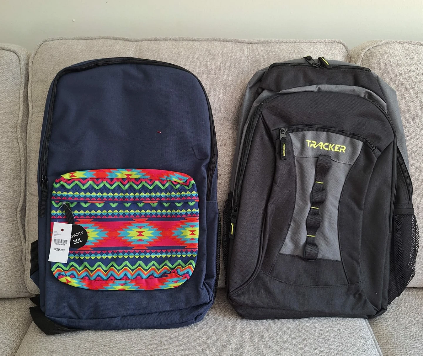 NEW WITH TAGS - Two large strong backpacks purchased from Bentlwy. Light-weight with two large compartments and one zipped outer pocket. Has side pouch for water bottles too.