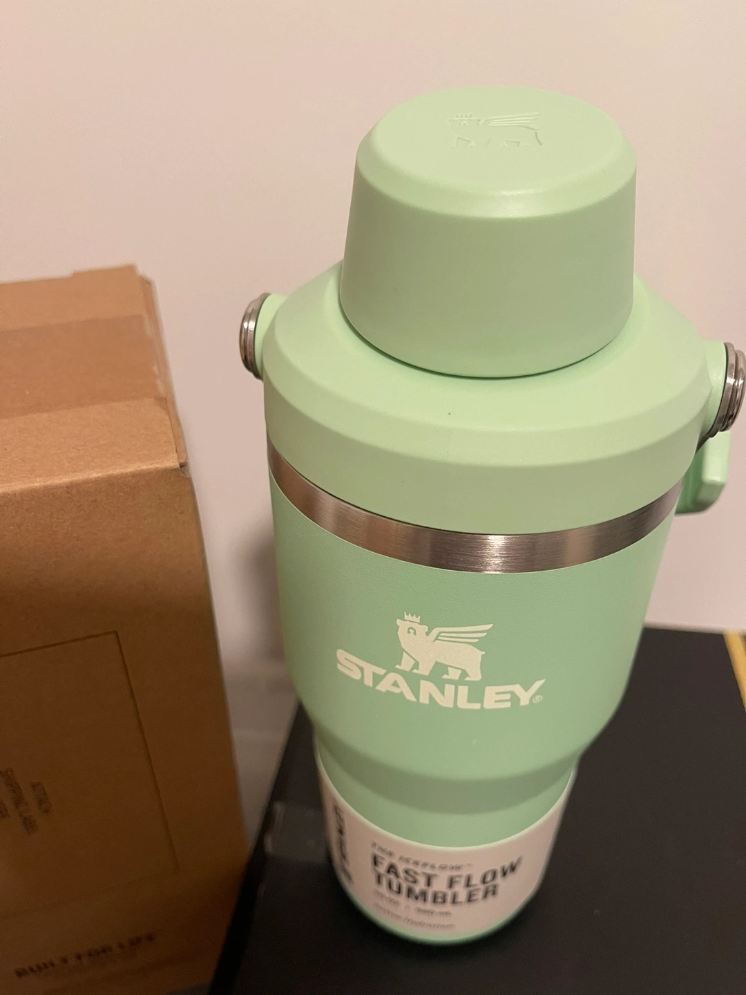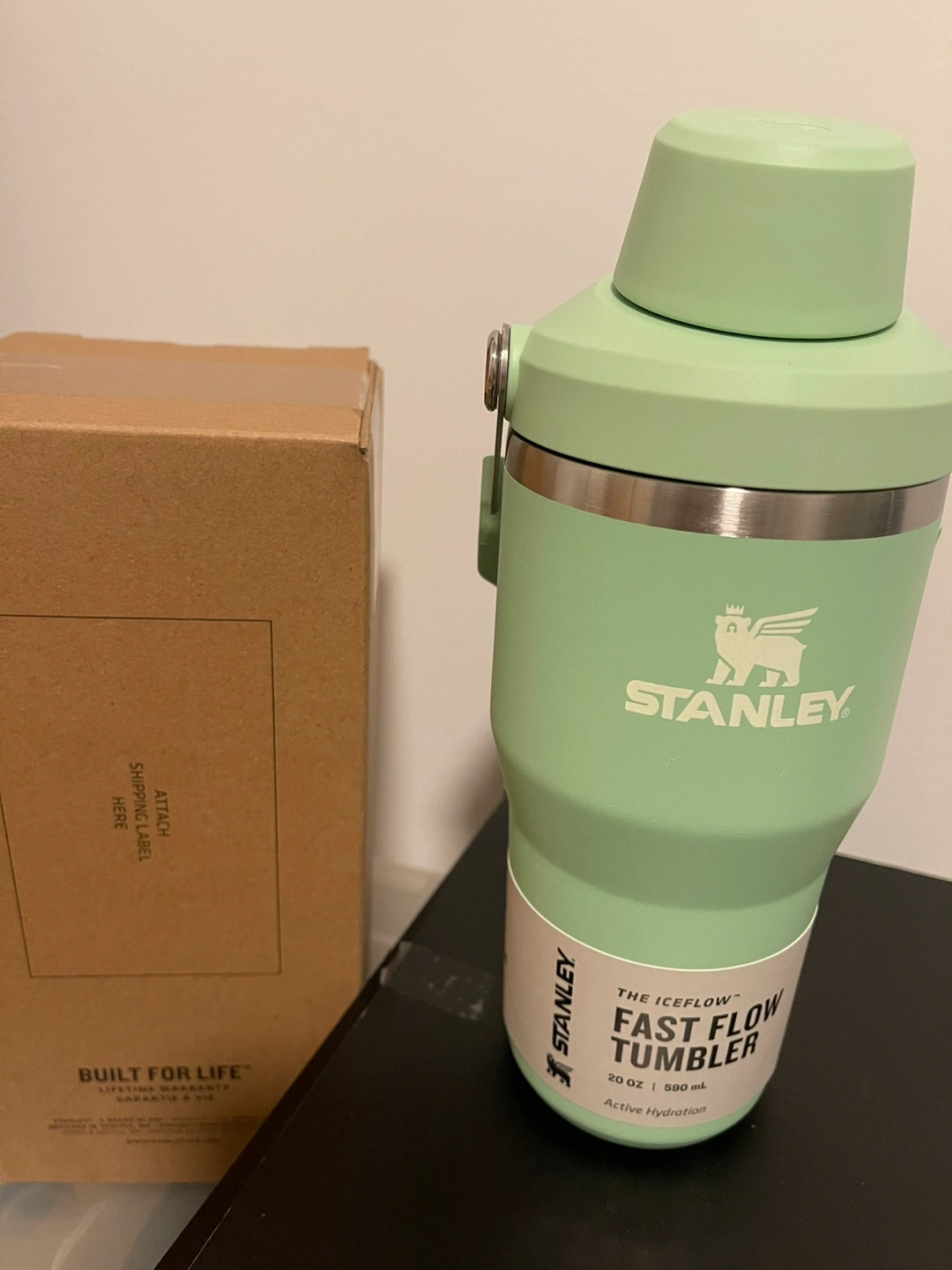 Selling a Stanley IceFlow Fast Flow Tumbler in a lovely light green colour! It holds 20 oz / 590 mL, perfect for staying hydrated. Comes with the original box!
