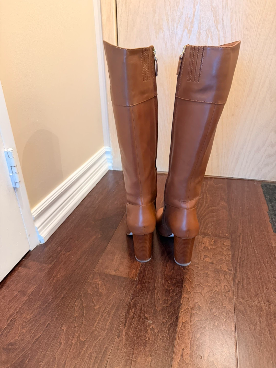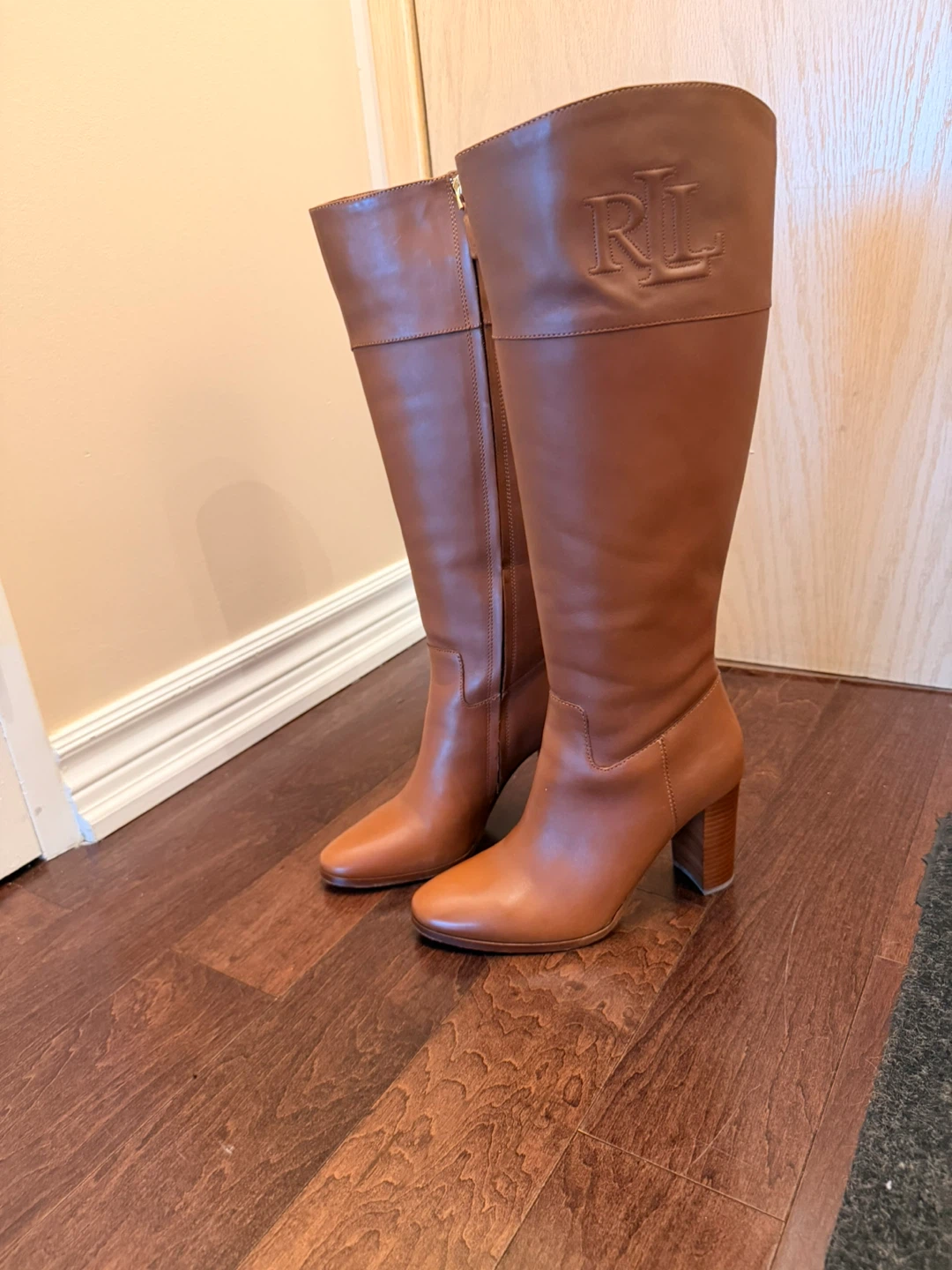 These are a pair of Ralph Lauren riding boots in excellent condition! They are a size US 8.5. The upper is 100% leather, and the lining is 80% textile and 20% synthetic. The outsole is also 100% leather. They are a beautiful tan colour!